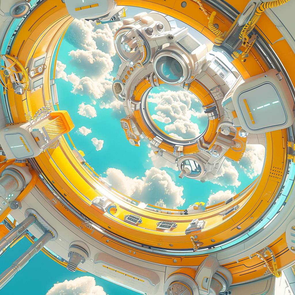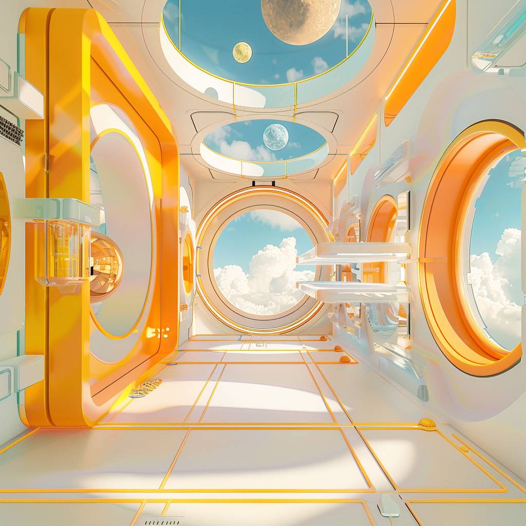 the space station is a 3d visualization of a futuristic space station, in the style of playful cartoon illustrations, yellow and orange, vibrant stage backdrops, expansive skies, bright palette, sky-blue and white, circular shapes --v 6.0