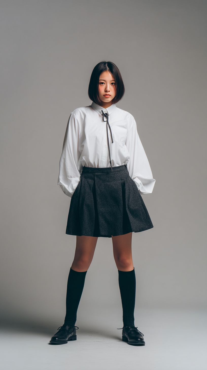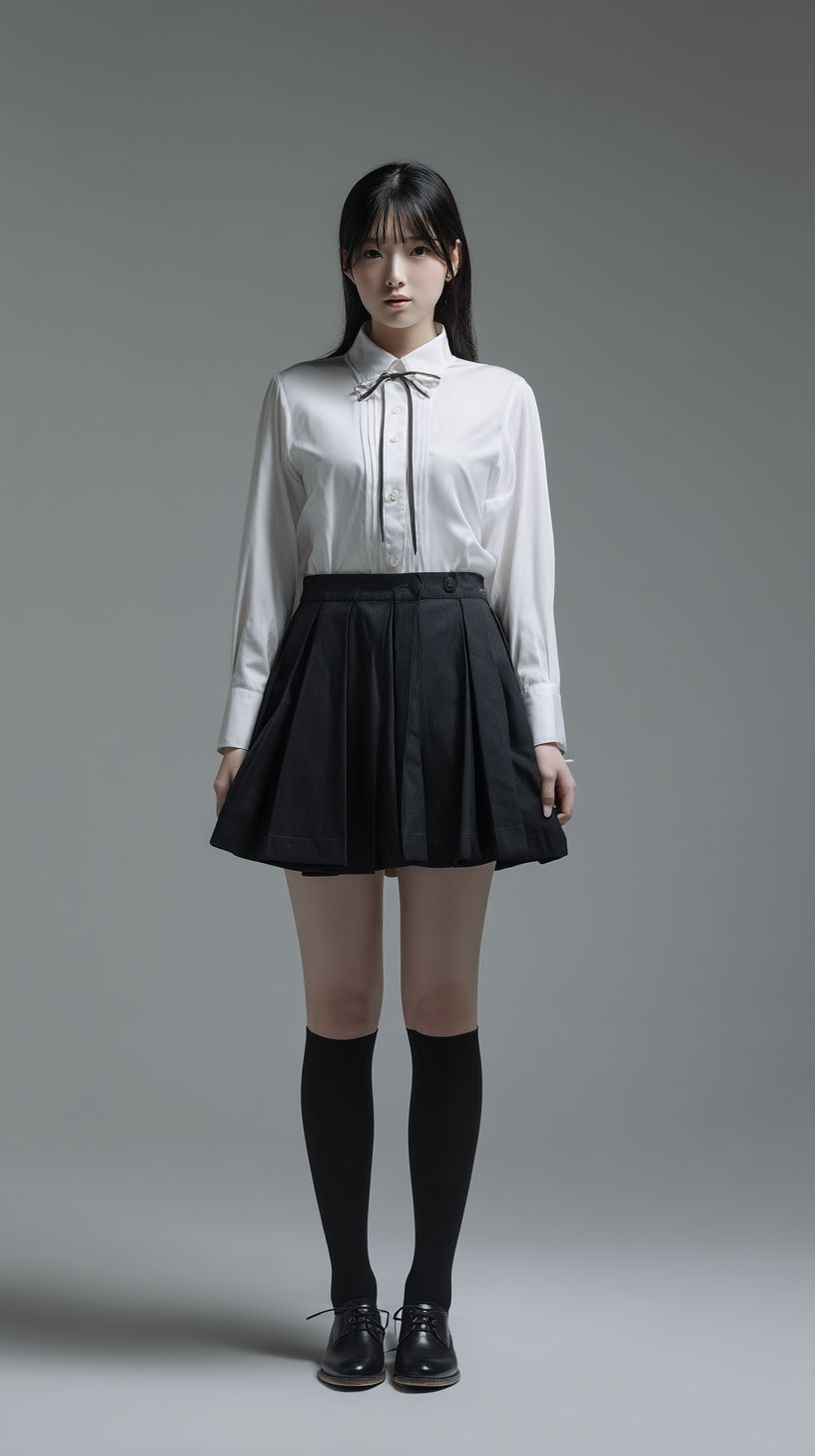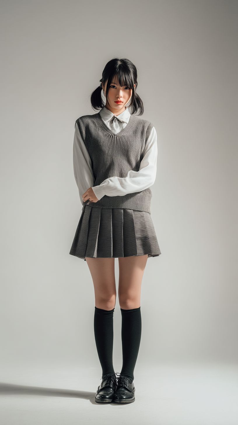 A 19-year-old Japanese fashion model in a stylish school uniform stands against a neutral gray background wearing a stylish outfit. The focus is on the texture and fit of the fabric, illuminated by soft, diffused lighting. The image is sharp and detailed, minimalistic, and has a high-quality catalogue style. 4K photo --ar 9:16 --quality 2 --raw --v 7.0 --s 50
