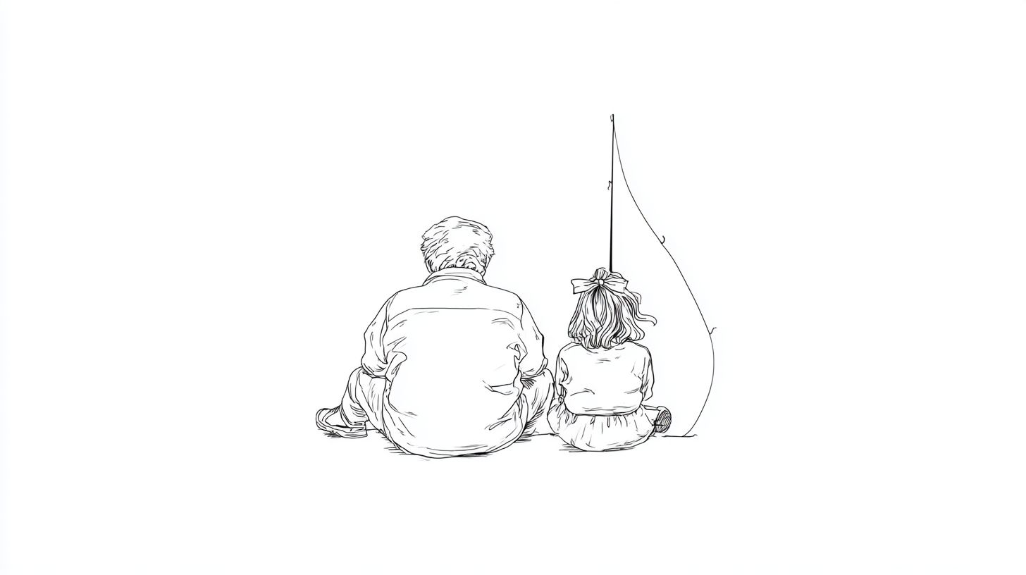 Ilustración de una nieta y un abuelo sentados juntos, el abuelo está pescando