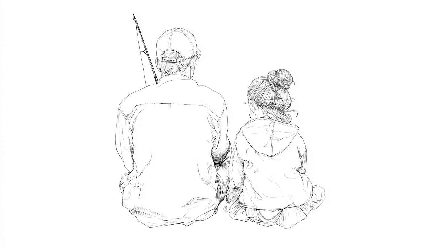 pencil drawn illustration of granddaughter and grandfather sitting, view from their back, grandfather is fishing, tattoo design, minimalistic and aesthetic, white background, black outline and contour --ar 16:9 --s 50 --v 7.0