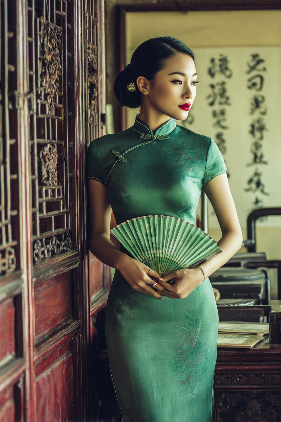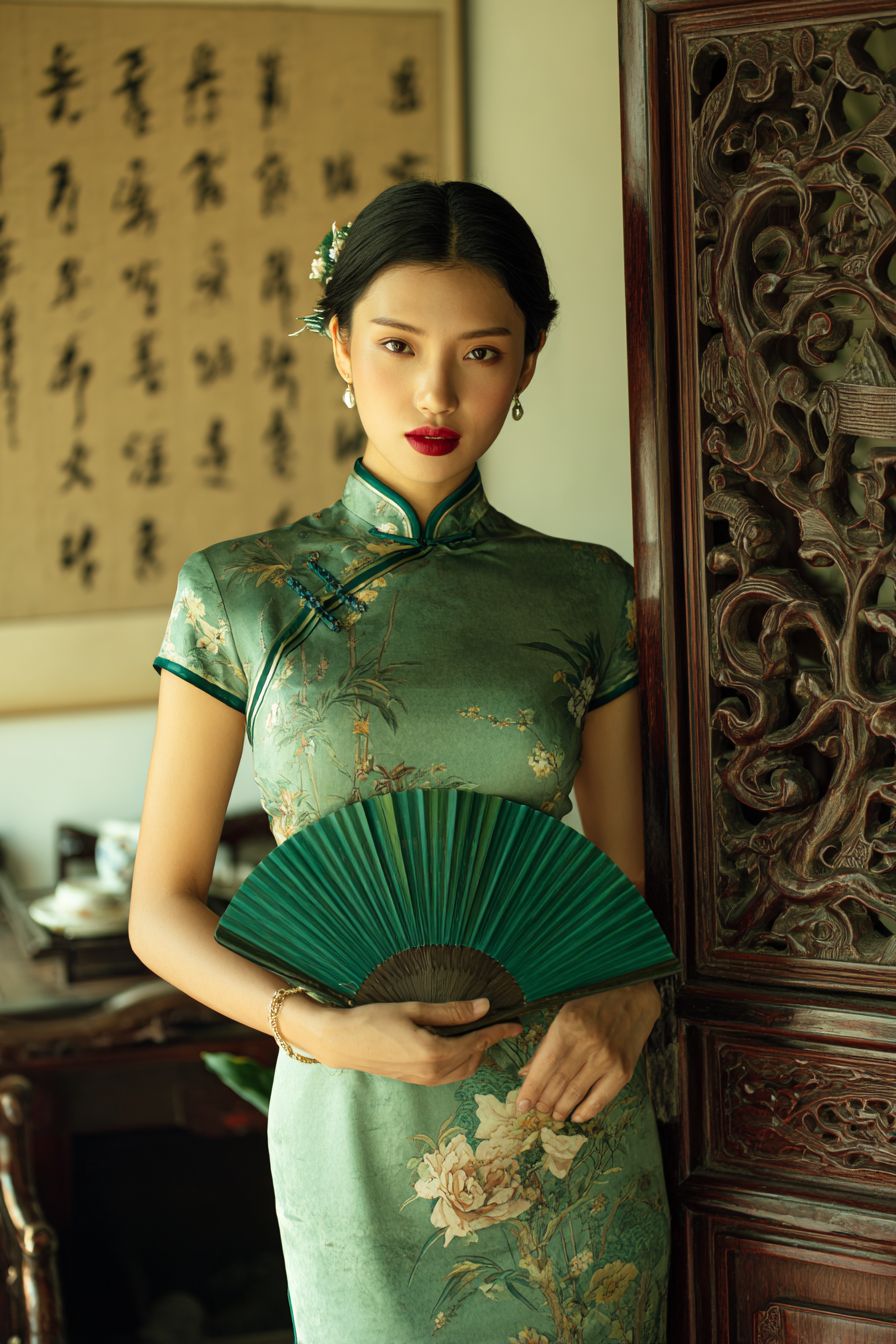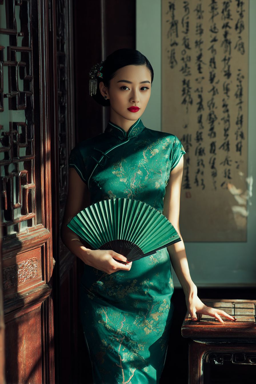 young beautiful Chinese woman in a jade-green silk qipao (cheongsam) with subtle floral embroidery and a mandarin collar, standing beside a carved wooden screen in a sunlit teahouse, elegant posture with both hands gently holding a green folding fan in front of her, sleek low chignon with a jade hairpin, classic red lips and soft eyeliner, warm diffused window light, polished rosewood furniture, a calligraphy scroll in the background, gentle film look, three-quarter body, 85mm --ar 2:3 --v 7.0