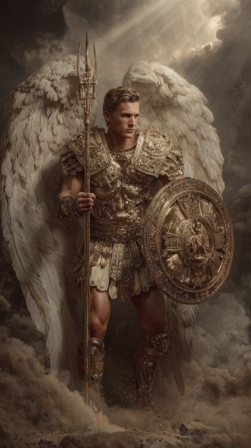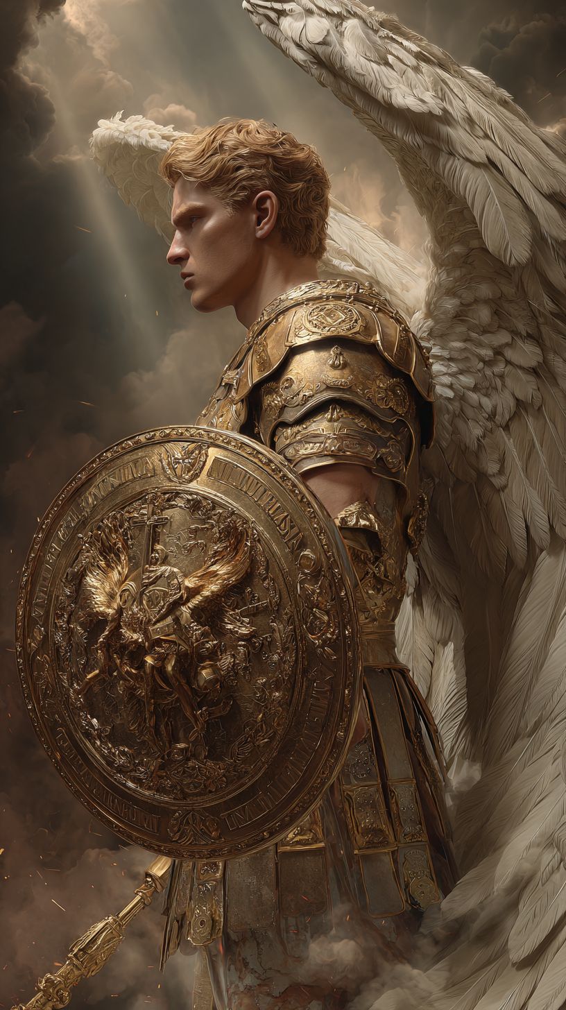 Retrato del Arcángel San Miguel con una armadura romana dorada que muestra su físico poderoso