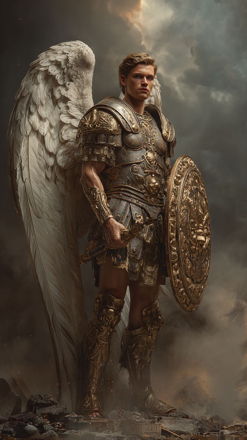 Retrato fotorealista de San Miguel Arcángel, notablemente apuesto con rasgos bien definidos y un poderoso físico musculoso, vistiendo una elaborada armadura dorada de legionario romano con intrincados grabados y pátina de guerra, enormes alas de plumas blancas cerradas plegadas detrás de su espalda, sosteniendo un escudo dorado ornamentado con símbolos divinos en una mano y una lanza plateada reluciente en la otra, de pie en una pose heroica de contraposto, mirando al espectador con una intensa, compasiva y protectora mirada, iluminado dramáticamente desde arriba con rayos divinos atravesando nubes de tormenta apocalíptica en movimiento, con cenizas y brasas girando en la atmósfera, suaves haces de luz dorada envolviendo a una figura distante y desconsolada que se arrodilla ante las ruinas de una iglesia gótica colapsada en el fondo, neblina volumétrica con rayos que se abren, paleta emocional de noche con cálidas iluminaciones divinas, composición cinematográfica, textura de piel hiper detallada, resolución 8K, estética épica de guerrero bíblico, fotografía de fantasía ultra realista.