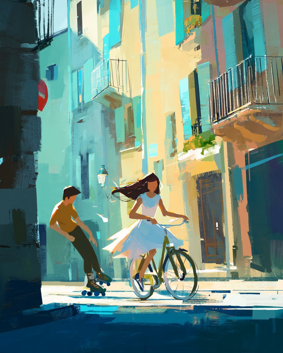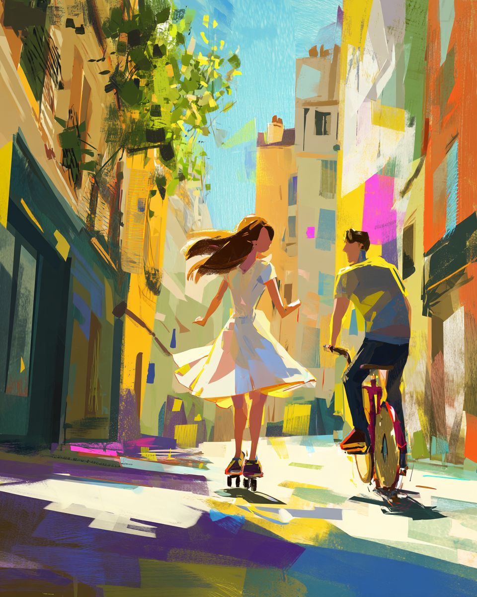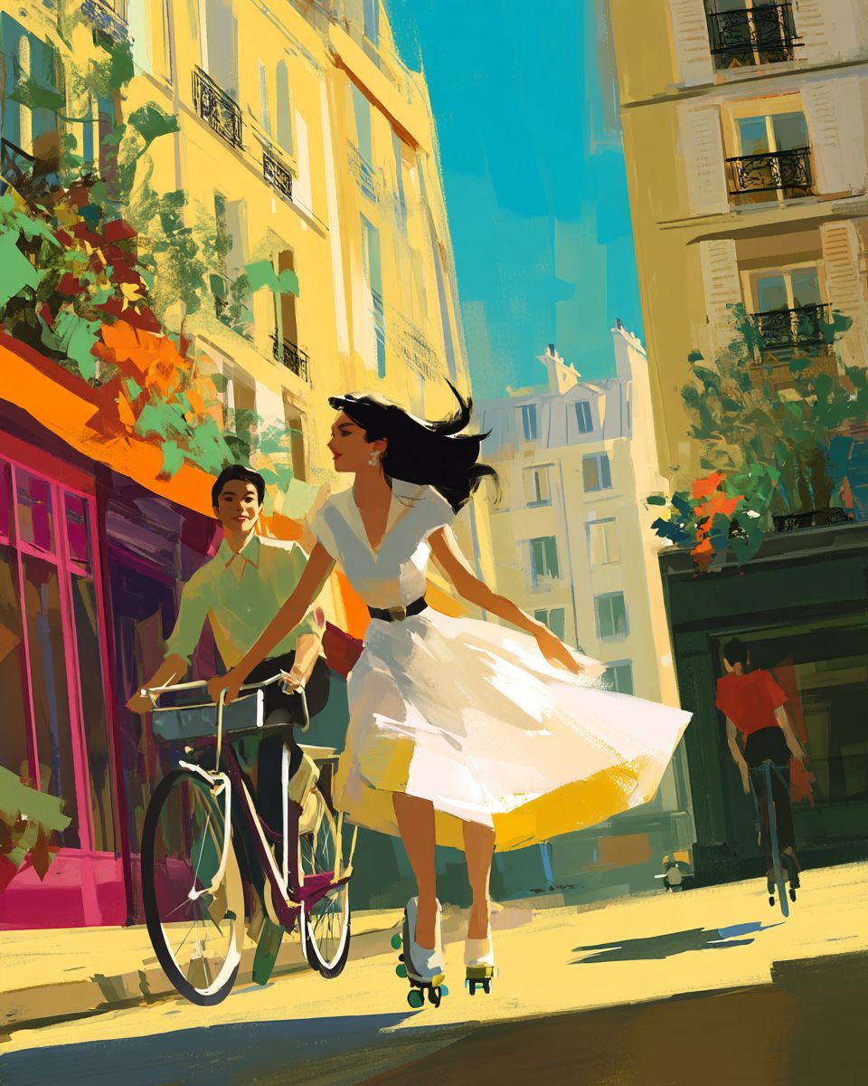 parisian street, parisian buildings, sunny day, woman in white dress, riding bike, flowing hair, fr three quarter view, man roller skating beside her, three quarter view, dynamic shot, by pascal campion atey ghailan --no flower eiffel --ar 4:5 --quality 2 --profile g3wlmqa --stylize 50 --v 7.0