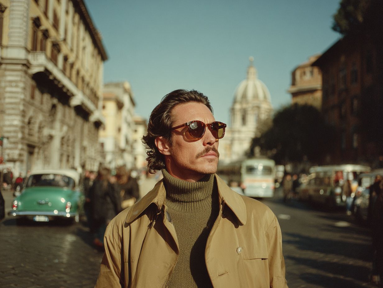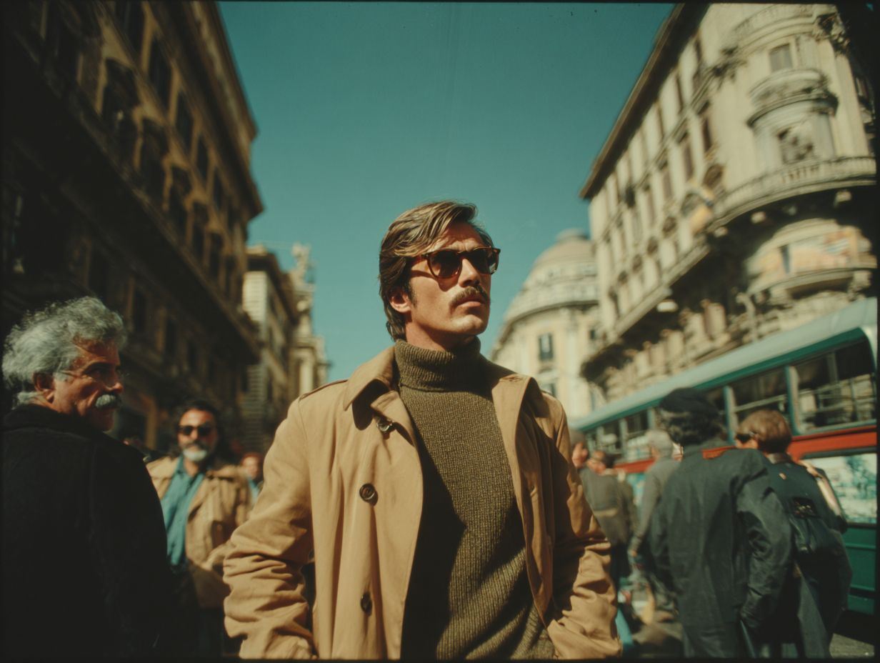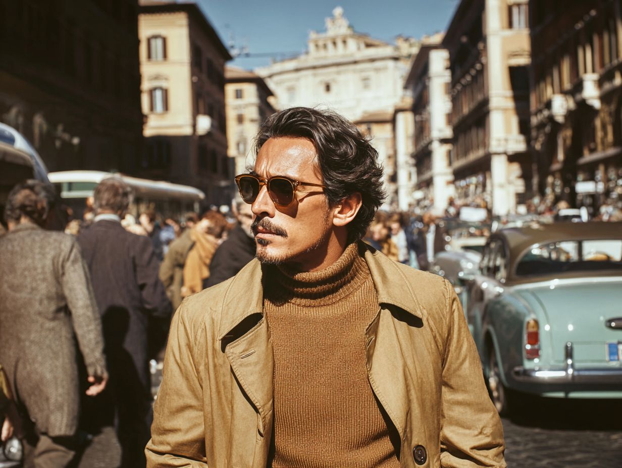 Toma de cuerpo entero en ángulo ancho, un hombre italiano estilo años 60 en sus 30, bronceado, ojos verdes, cabello largo hasta el hombro peinado hacia atrás con un bigote, gafas de sol de acetato carey, suéter de cuello alto y abrigo de gabardina beige, caminando por una calle concurrida en Roma, toma cinematográfica, fotograma de película cinematográfica.