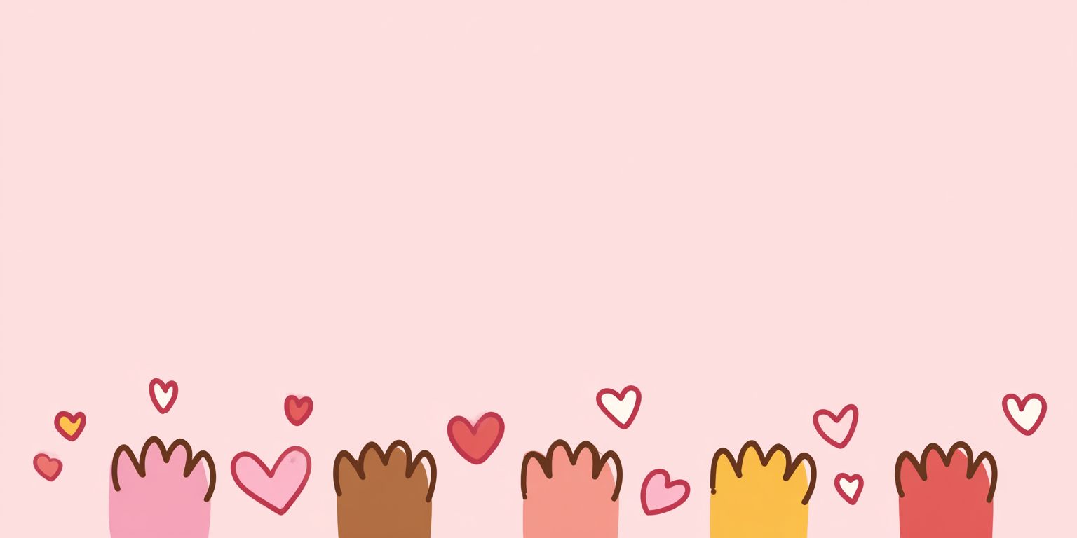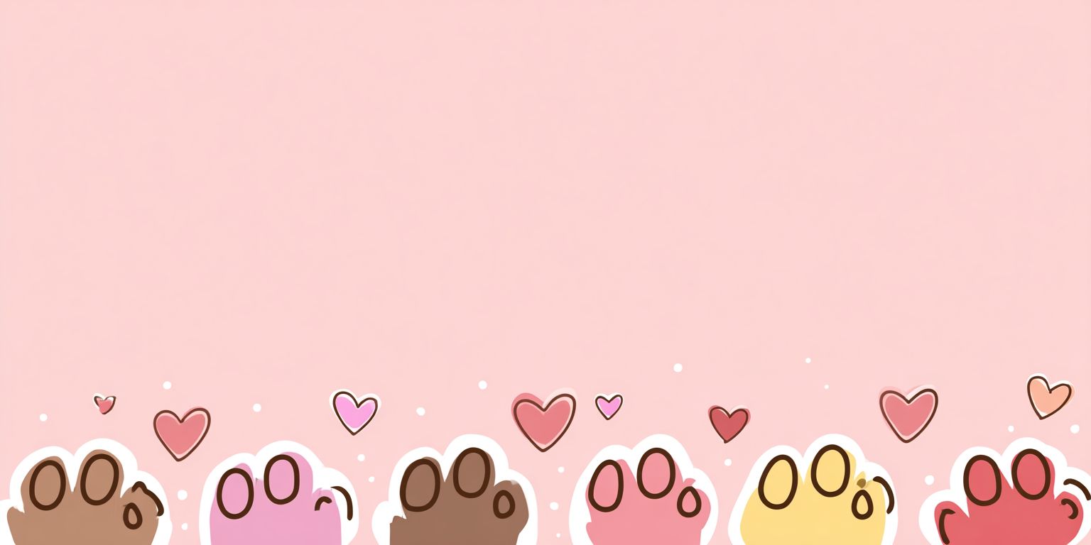 a cute cartoon design of cat paws with hearts, on a pink background, with simple lines and a flat style. the design features minimal details, with a minimalist aesthetic. the top is white, and the bottom has four cat paw prints in different colors: pink, brown, yellow, and red. there is some space between each set of kitten footprints, with heart-shaped shapes above them. --ar 2:1 --v 7.0 --p 78soi4x --s 50