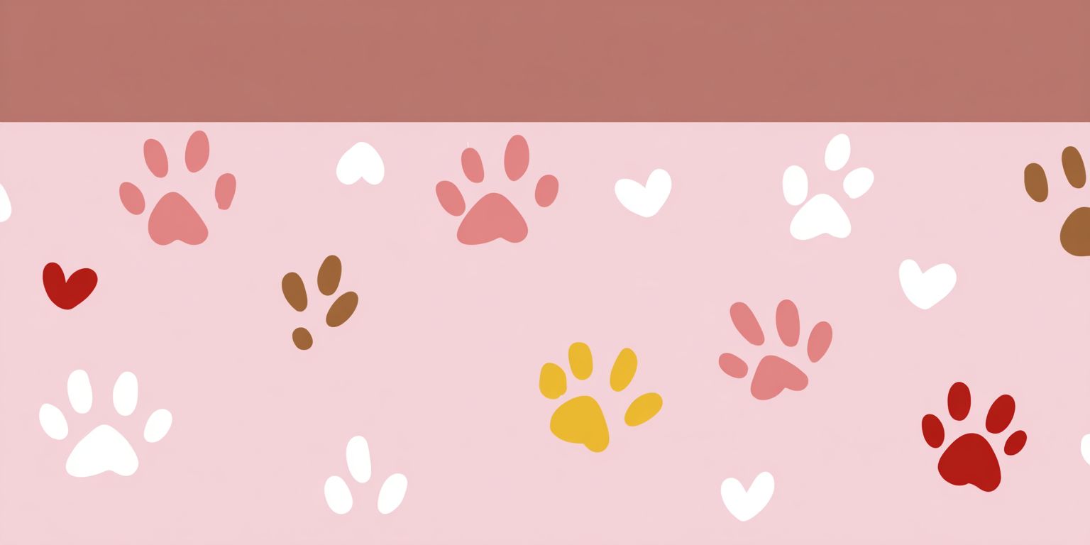 Un diseño de dibujo animado de patas de gato con corazones, sobre un fondo rosa, con líneas simples y un estilo plano. El diseño presenta detalles mínimos, con una estética minimalista. La parte superior es blanca y la parte inferior tiene cuatro huellas de patas de gato en diferentes colores: rosa, marrón, amarillo y rojo. Hay un poco de espacio entre cada conjunto de huellas de gatito, con formas de corazón encima de ellas.