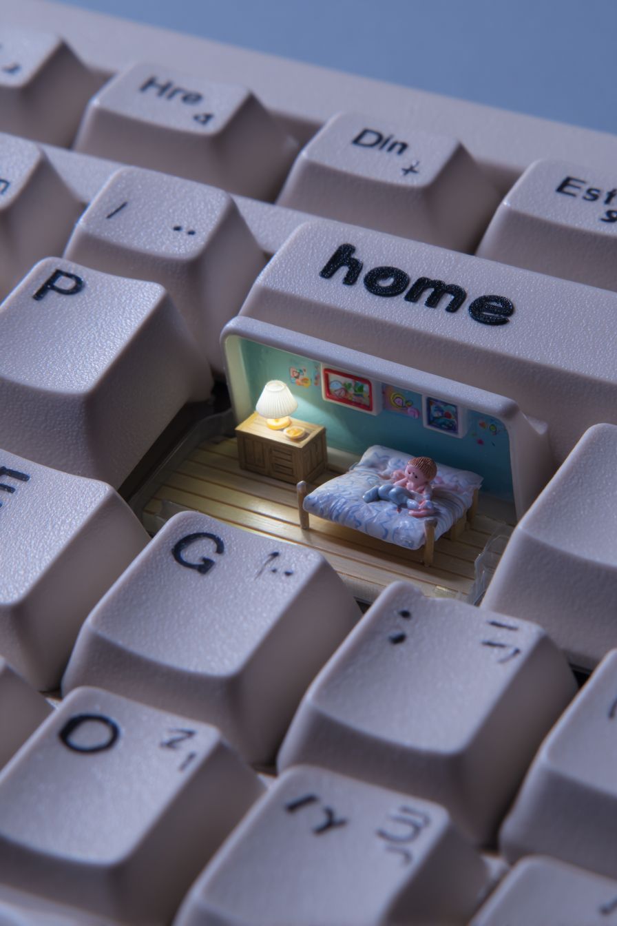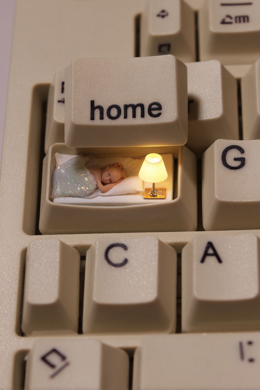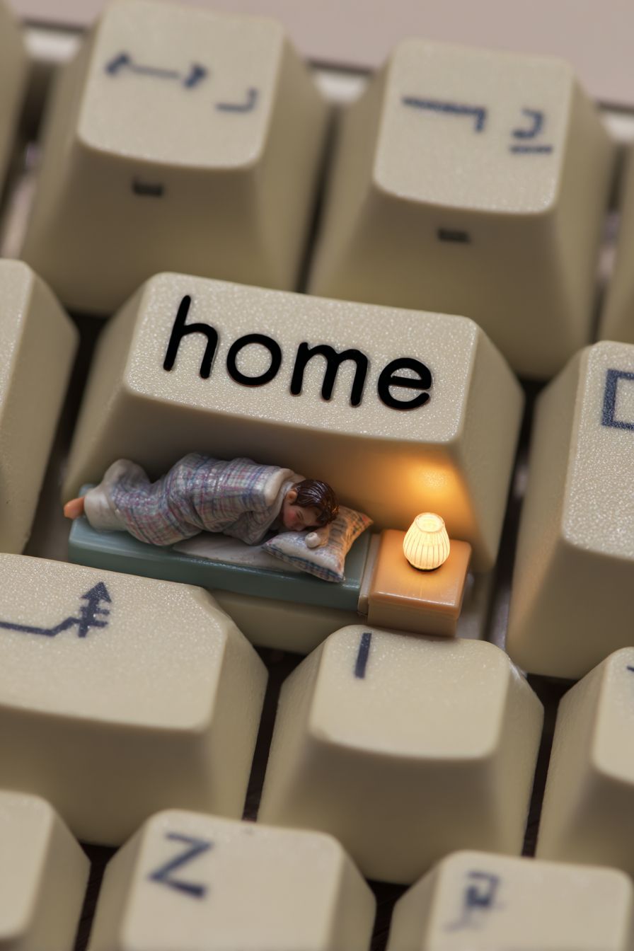a miniature bedroom with a bed, night lamp, and a sleeping person inside the "home" key on an old beige computer keyboard. the word "home" is written in bold letters above it. there's also a desk next to that, and there should be no other keys visible except for the ones featuring the letters p, g, or h. this scene captures the simplicity of home life within the minimalistic space created by a single white space bar. --ar 85:128 --v 7.0 --p 78soi4x --s 50