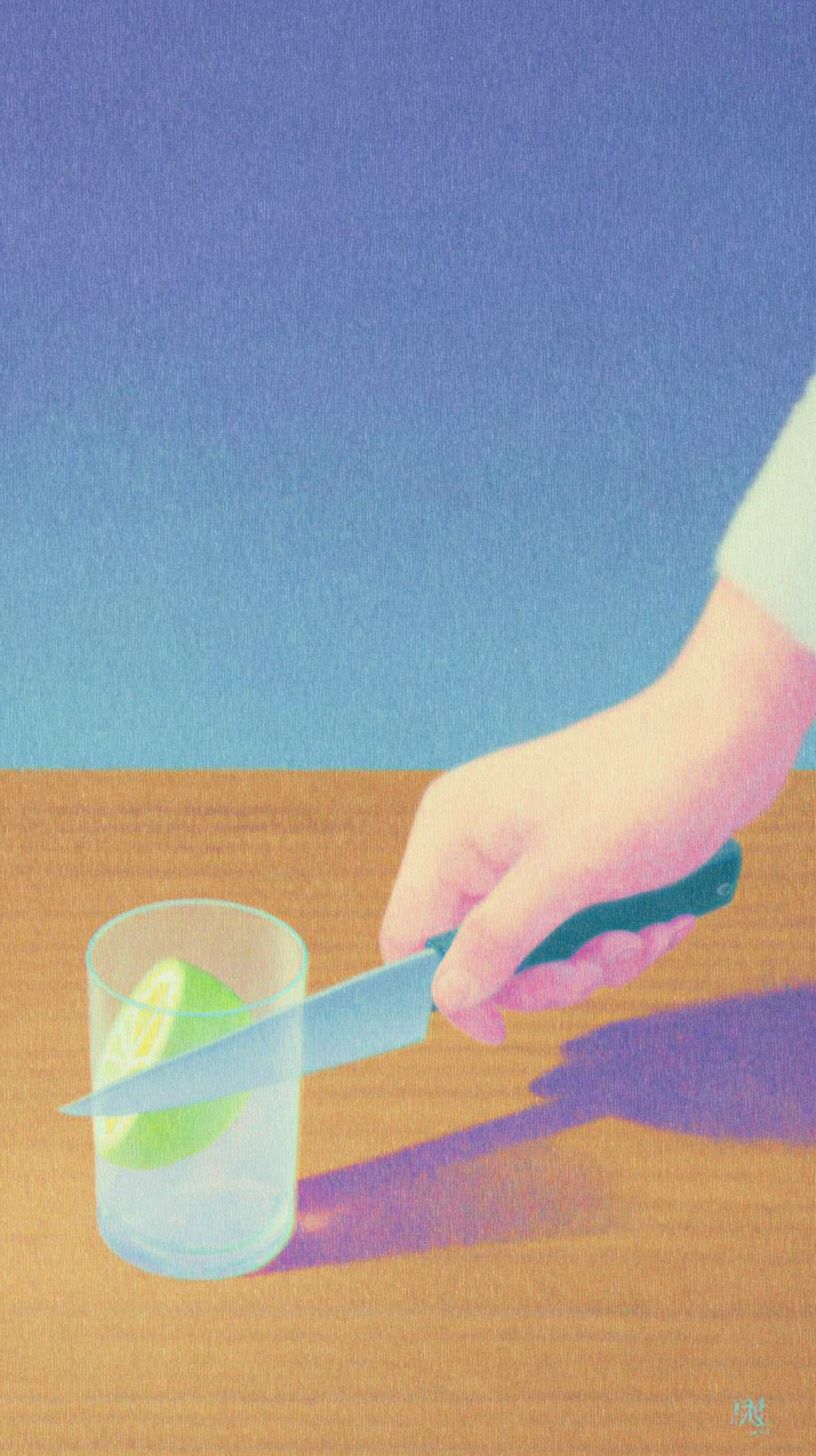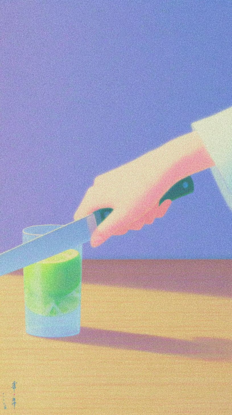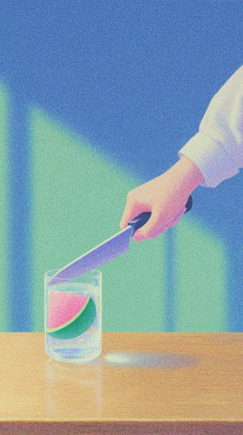 A realistic close-up of a human hand slicing a transparent glass fruit with a sharp knife, wooden table, cinematic soft light, ASMR aesthetic, minimal background --ar 9:16 --sref 1288394546 --v 7.0 --p 78soi4x --s 50