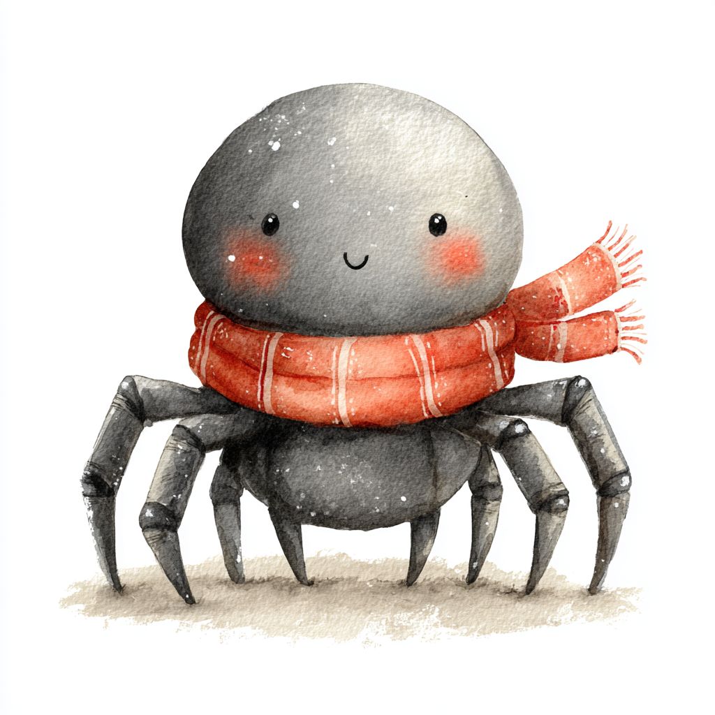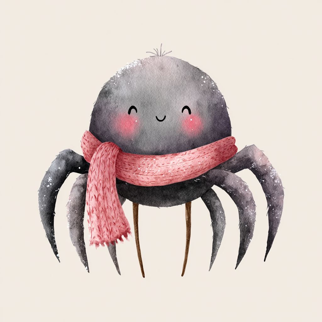 Cute watercolor spider illustration standing while wearing a cozy knitted scarf, soft warm gray body with lighter belly, rounded plush body, tiny dot eyes with peaceful smile, rosy blush cheeks, simplified anatomy with smooth rounded shapes, hand-painted watercolor texture with gentle pigment pooling, Valentine’s Day nursery illustration, isolated on a clean white background, no outlines, no shadows, high-resolution watercolor clipart. --v 7.0