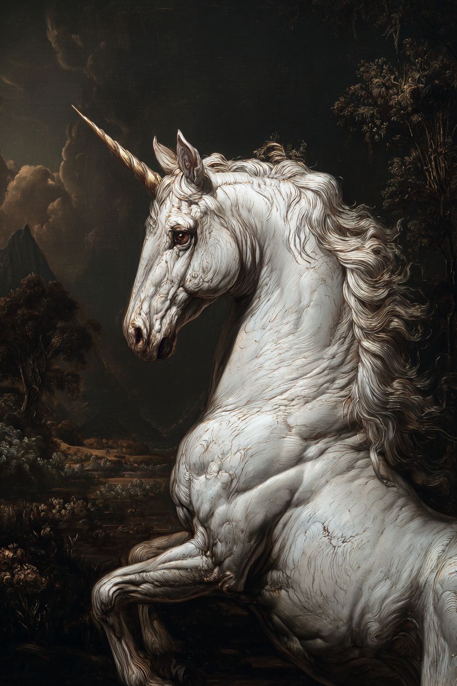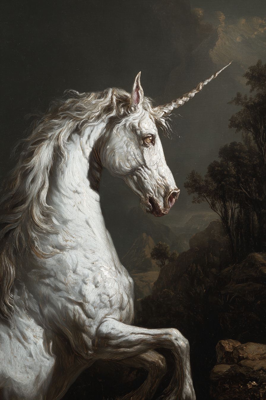 a side on view of a rearing white unicorn horse, it has a slight shiny gold tone to it's coat. the unicorn has a slightly anguished expresion on it's face, as a highly detailed high contrast oil painting. the background is a very dark muted tone landscape with a few rocks and trees. --ar 2:3 --v 7.0