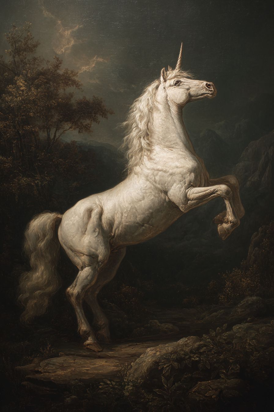 Una vista lateral de un caballo unicornio blanco en posición de rear, con un ligero tono dorado brillante en su pelaje. El unicornio tiene una expresión ligeramente angustiada en su rostro, representado como una pintura al óleo altamente detallada y de alto contraste. El fondo es un paisaje de tonos oscuros y apagados con algunas rocas y árboles.