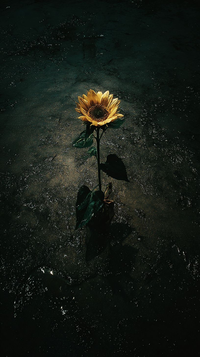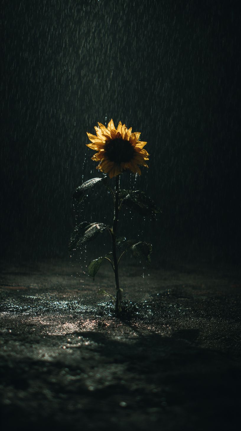 The scene is immersed in deep darkness, as if one were standing on the ground of an endless forest. The soil is brownish-black, moist and textured, with tiny cracks and undulations faintly visible in the shadows. A cool, misty rain hangs in the air, and slanting raindrops cascade down from the sky, splashing up tiny droplets as they hit the ground, making the entire environment appear silent and profound. The raindrops appear as thin, silvery lines in the darkness, appearing cold and sharp when captured by the faint light. In the center of this damp land, a distinct, clearly recognizable sunflower is firmly rooted in the soil. Its golden petals fan outward in a bright, circular halo--broad, neat, and unmistakably sunflower-like. Each petal glows with a soft warmth even in the rain, forming a vivid contrast against the surrounding darkness. At the heart of the flower lies a dark, textured central disk, deep brown to nearly black, rich with detail and slightly glistening as the rain collects upon its surface. The sunflower’s stem is thick, sturdy, and upright, bearing the weight of the bloom with effortless strength. Large, coarse green leaves extend from the stem, their surfaces glossy with rainwater, tiny droplets trembling at their edges. The sunflower stands out boldly in the gloom, its warm color radiating like a small sun against the cold, drifting mist. Rain slides along its petals, gathering at the tips and catching faint glimmers of warm light. Even in the chilling darkness, the sunflower’s golden glow feels vibrant and alive. A soft beam of warm light pierces the heavy shadows from the lower right corner of the image, illuminating the sunflower. Bathed in this gentle glow, the flower appears radiant and resilient, like a shard of daylight surviving in the [...]
