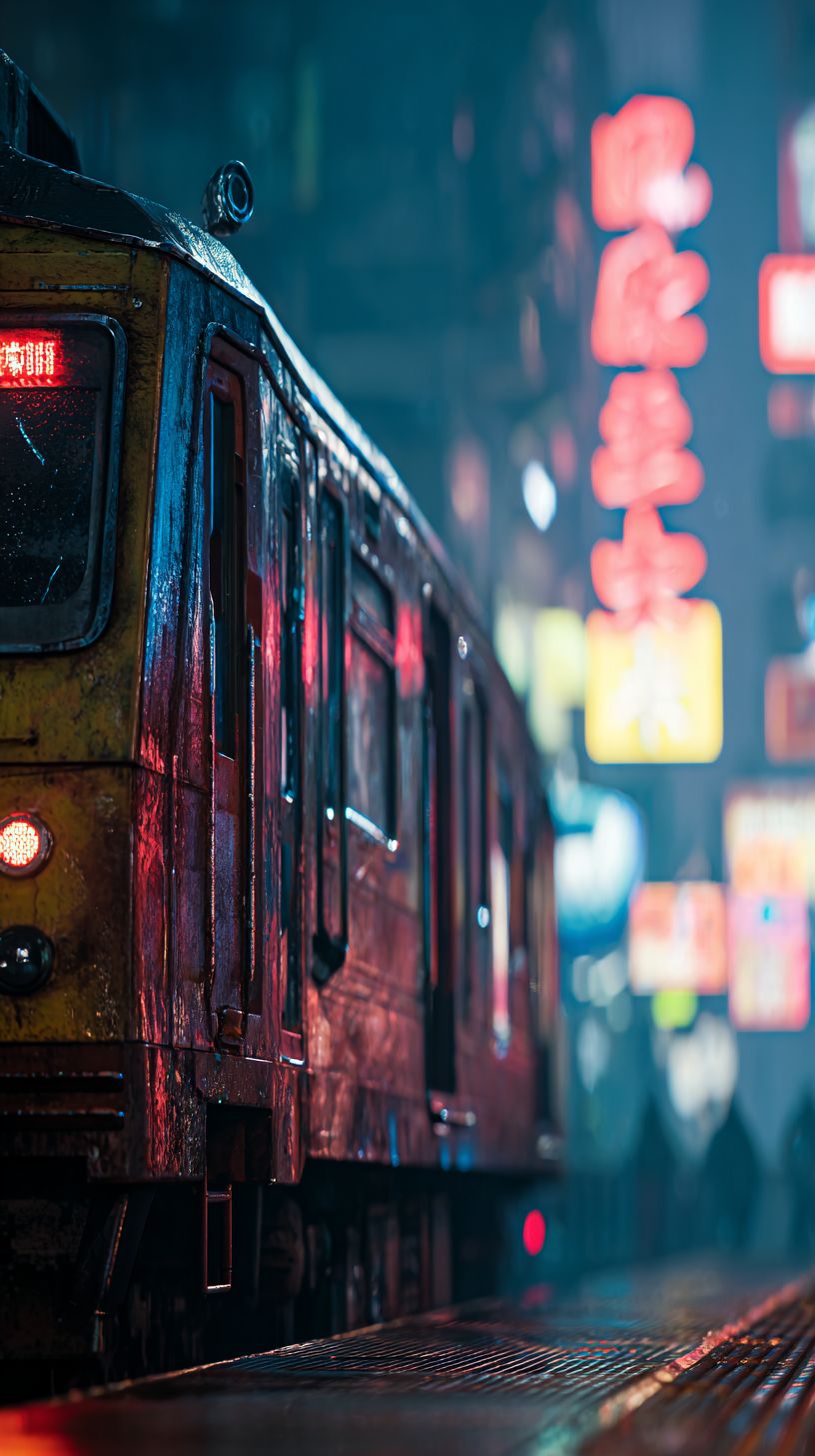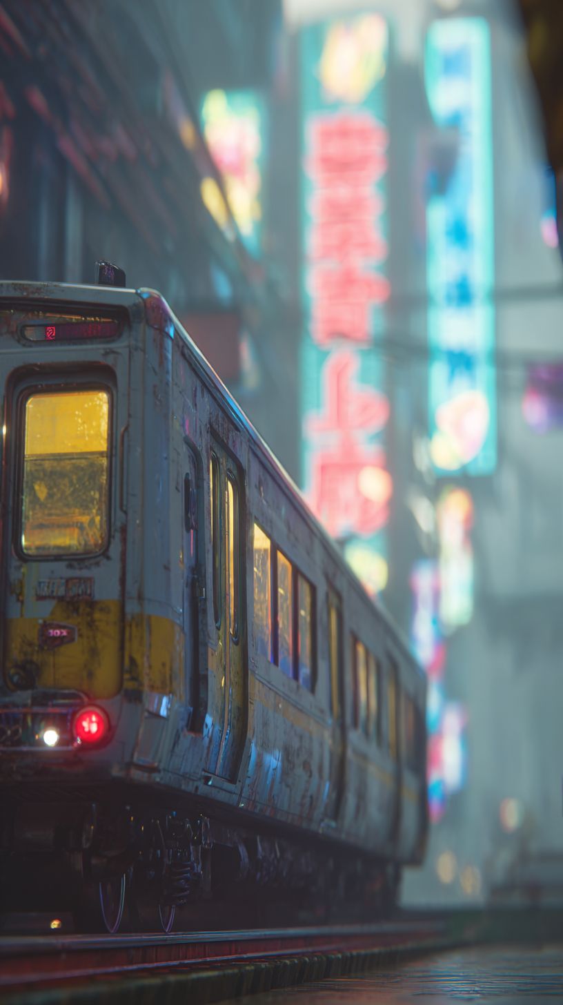 Ultra-realistic cinematic wide shot of a futuristic train passing a cyberpunk city neon signs, futuristic architecture,train has heavily weathered paint, realistic metal texture, background is foggy, Shot on a 85mm prime, f/1.8, ISO 100, 1/500s for shallow depth of field and creamy background separation while maintaining razor-sharp eye focus. Lighting is cinematic with neon light reflecting on metal surfaceswith high-end photo realism--neutral cinematic color grading, restrained micro-contrast, ultra-fine film grain, physically accurate reflections, global illumination, ray-traced lighting, hyper-detailed textures, no stylization, photorealistic, 8K detail. --ar 9:16 --raw --s 50