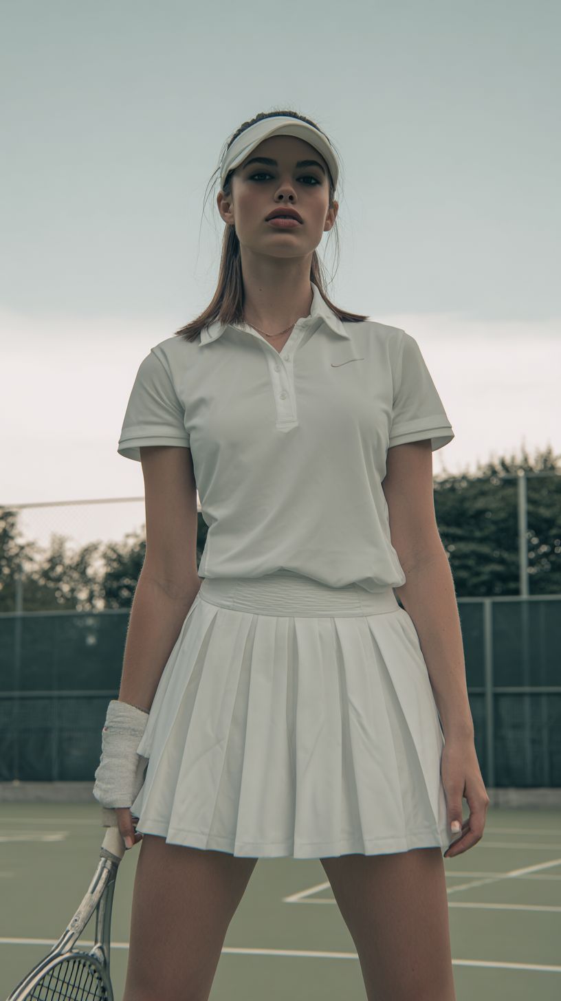 Una joven atleta en una cancha de tenis, vistiendo una elegante camiseta de polo de tenis metida en una falda plisada, con una visera, sosteniendo una raqueta de tenis, mostrando una postura atlética confiada, estética de ropa deportiva premium, con luz natural, ambiente cinematográfico, fotografía de 35 mm, profundidad de campo, ultra-realista.