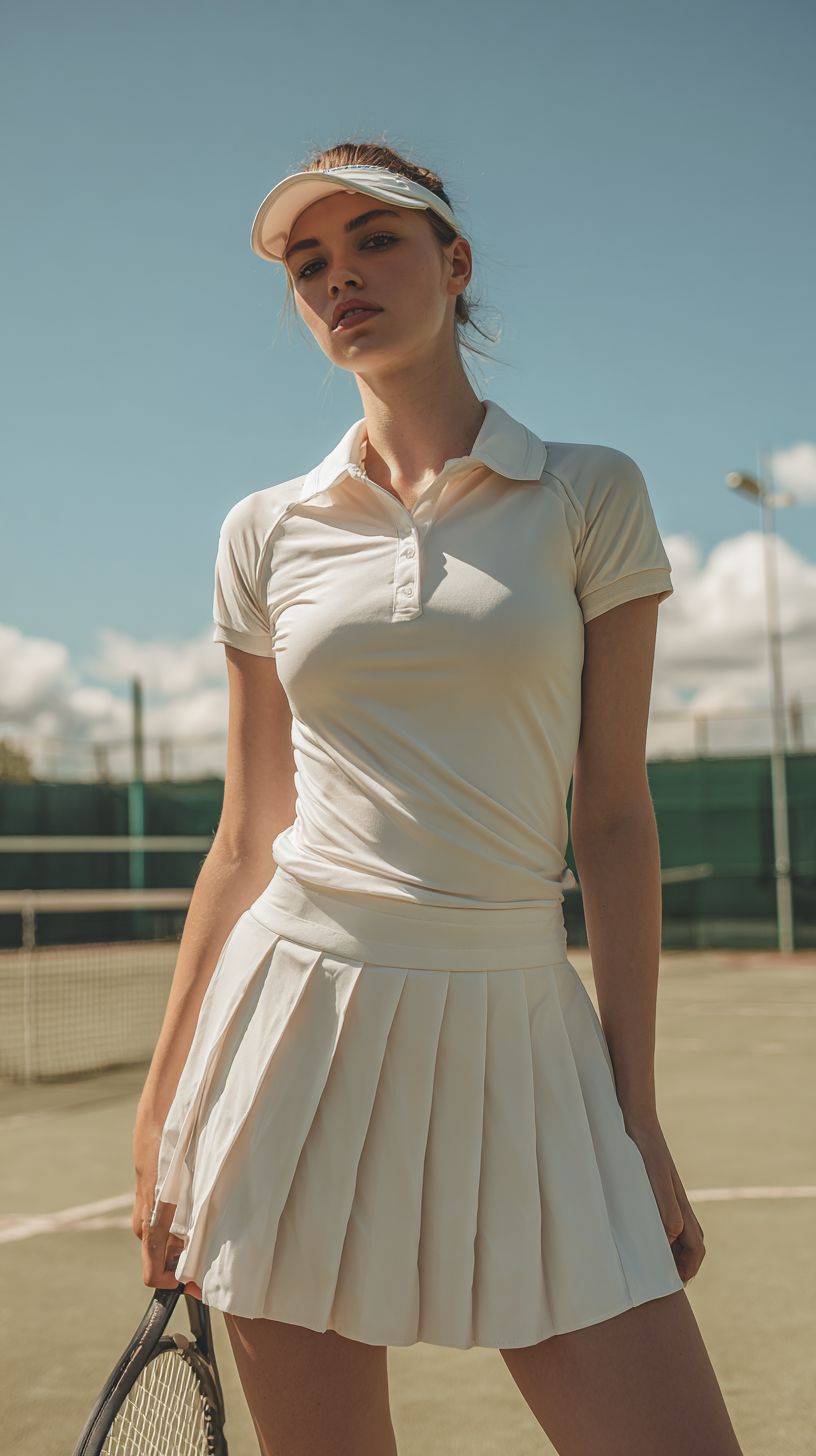 young athletic woman on a tennis court, wearing an elegant tennis polo shirt tucked into a pleated skirt, visor, holding a tennis racket, confident athletic stance, premium sportswear aesthetic, natural daylight, cinematic mood, 35mm photography, depth of field, ultra-realistic --ar 9:16 --raw --s 50
