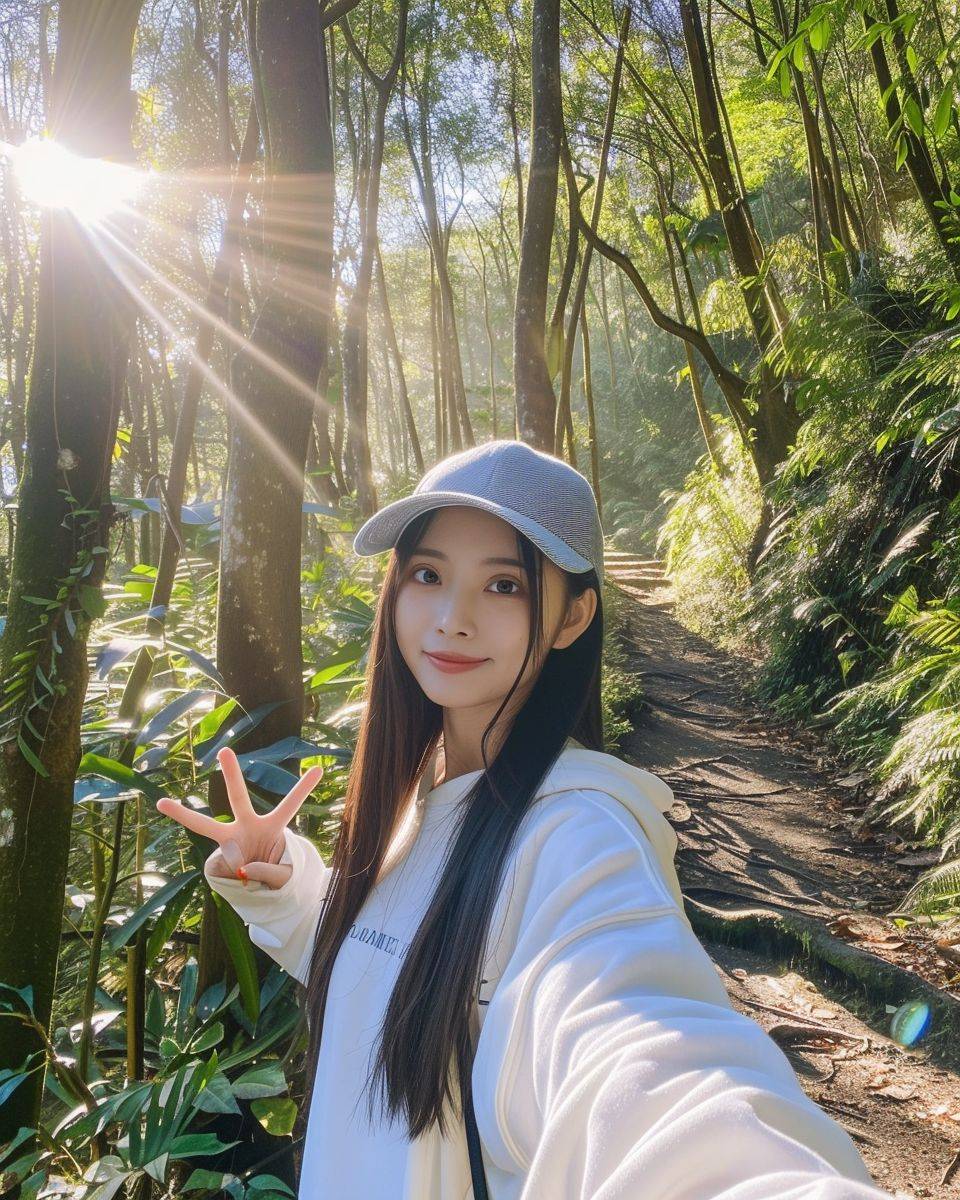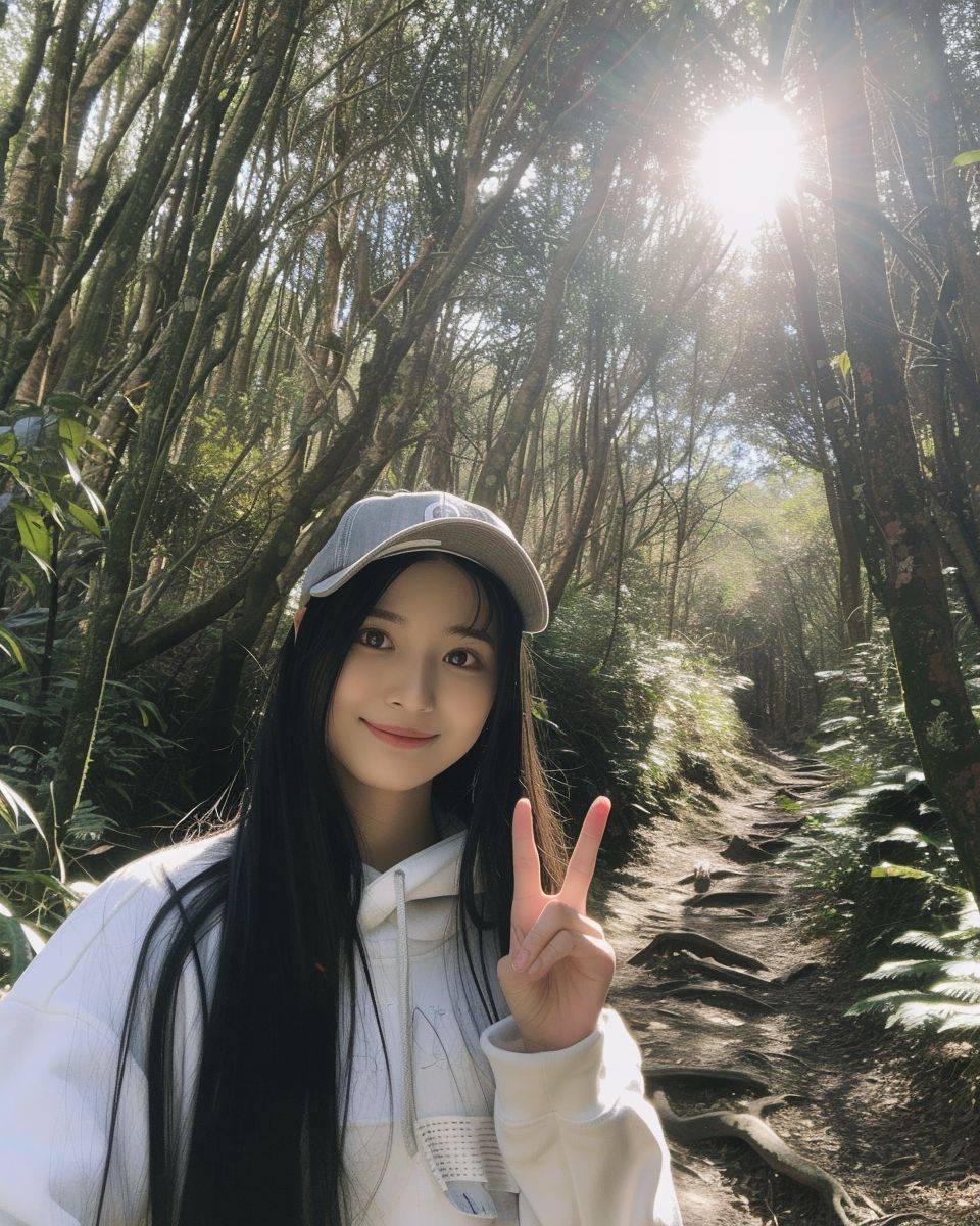A girl who looks like TWICE Tzuyu takes a selfie, shot with iPhone15, frontal shot, slightly fat, wearing a white sweatshirt, denim baseball cap, long straight black hair, victory sign on her right hand, on a forest path in Alishan, Taiwan, with tropical alpine trees , Sunlight filtering through the leaves, the light is bright, even and soft. --style raw --ar 4:5 --v 6