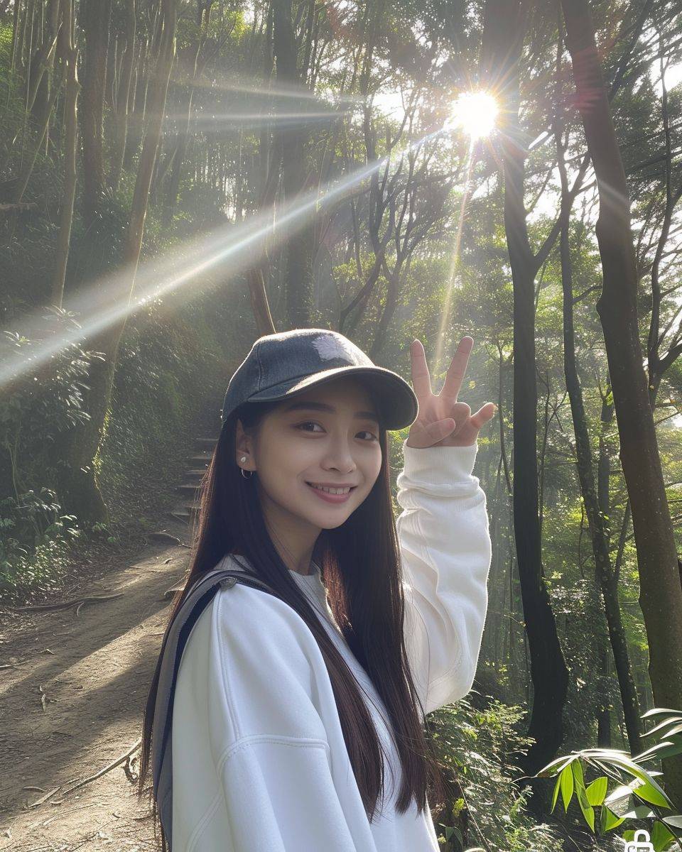 Una chica que se parece a Tzuyu de TWICE se toma una selfie en un camino del bosque en Alishan, Taiwán, vestida con una sudadera blanca y una gorra de béisbol de mezclilla, con el cabello negro largo y lacio, haciendo un signo de victoria con su mano derecha, la luz del sol filtra a través de las hojas creando una luz brillante y suave.