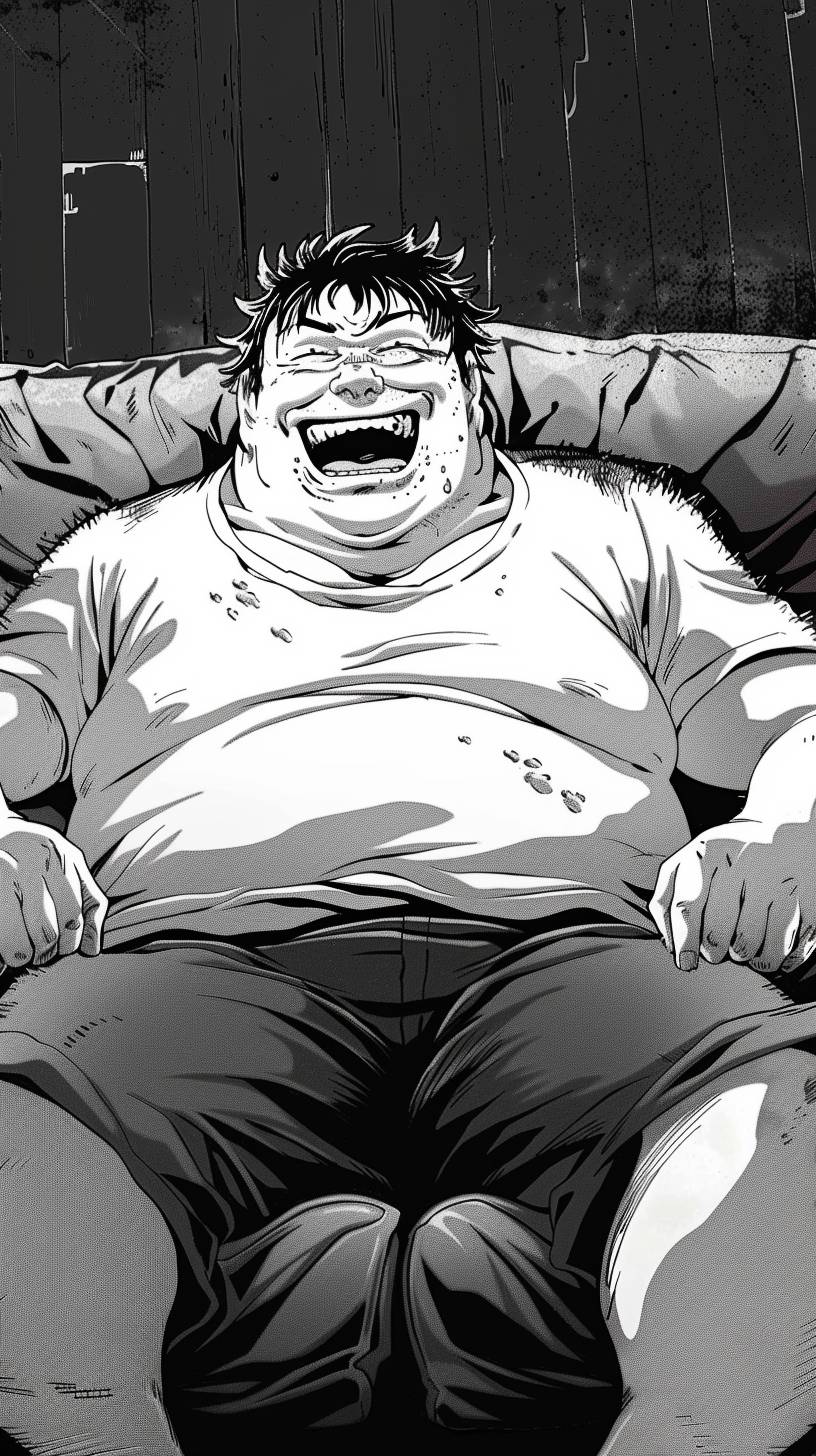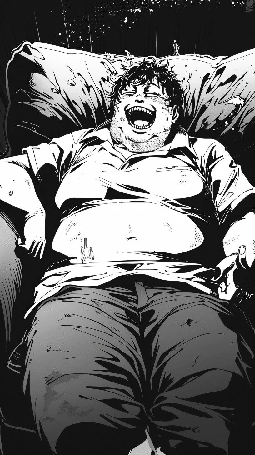 Manga en blanco y negro, al estilo de Junji Ito, que presenta a un hombre jabalí salvaje obeso de 300 libras sentado en un sofá rasgado, riendo a carcajadas. Tiene el cabello corto y negro y lleva una camiseta de manga corta blanca. Por la noche, cuenta con un primer plano frontal y tomas cercanas en el primer plano, con una paleta de colores luminosa y un estilo realista. Presenta un estilo mate, azul oscuro y ámbar, cómics subterráneos, imágenes UHD, aplicaciones sutiles de tinta, ilustraciones, verde oscuro y azul oscuro, contornos negros y una atmósfera oscura y aterradora.