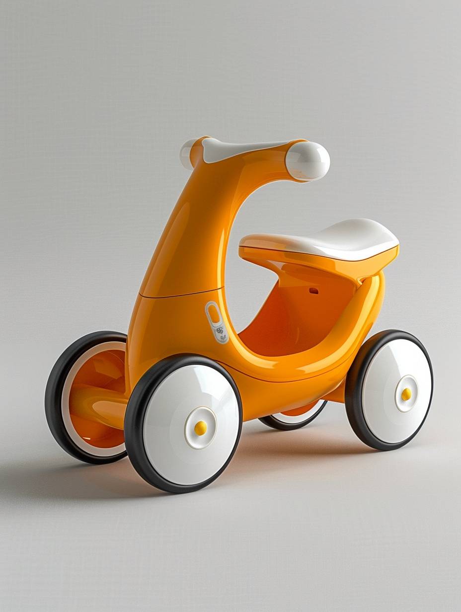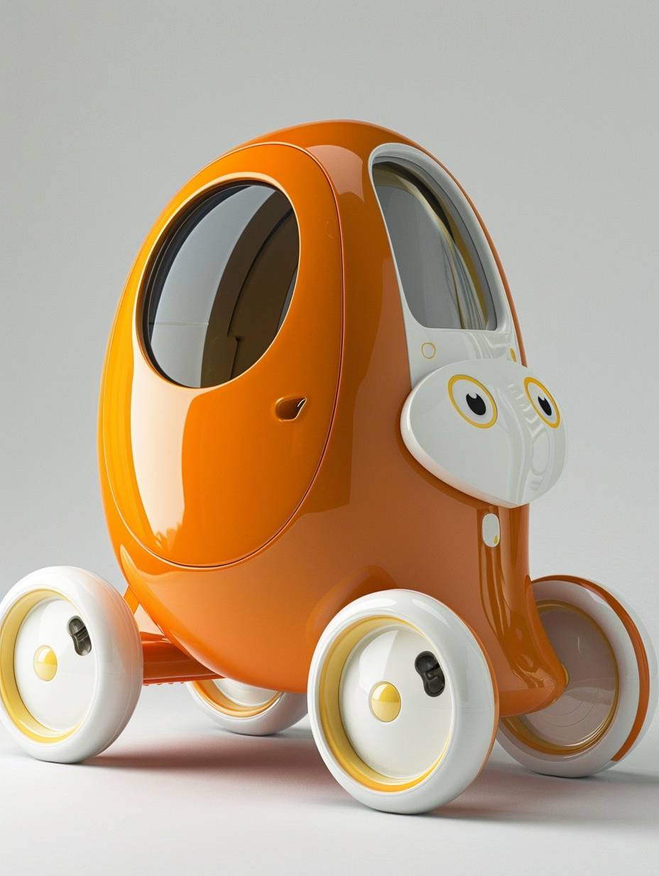 Baby toy car, children's scooter for walking with an orange body and white wheels. The top of the seat is rounded to reflect light. There is also a small window on each side through which you can see inside it. On one end there’s a cartoon style steering wheel that has two eyes drawn in yellow paint in the style of a cartoon. This design adds fun and visual appeal while enhancing driving safety. It stands upright against a pure white background, providing clear contrast between colors. --ar 3:4 --stylize 250 --v 6.0