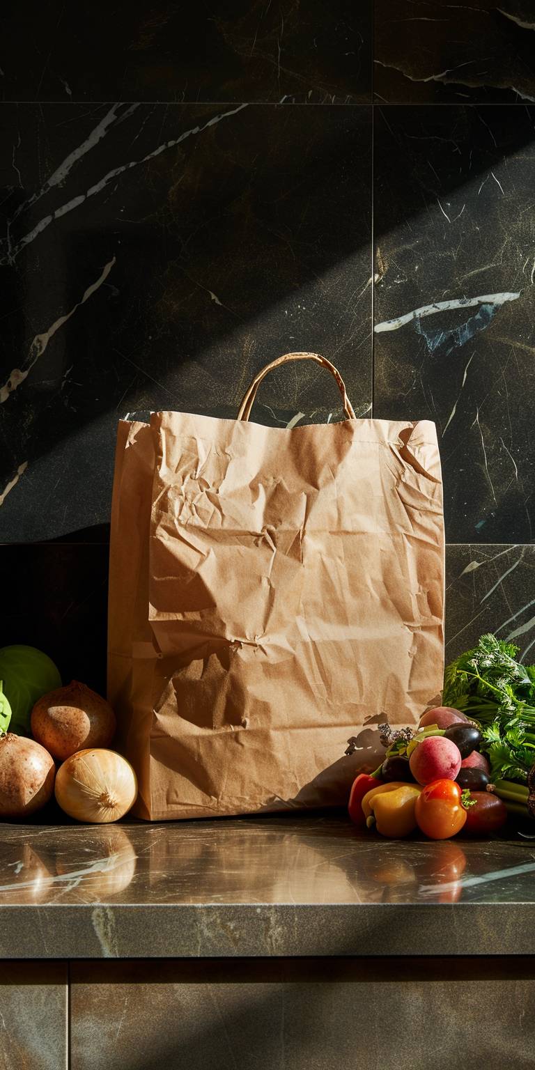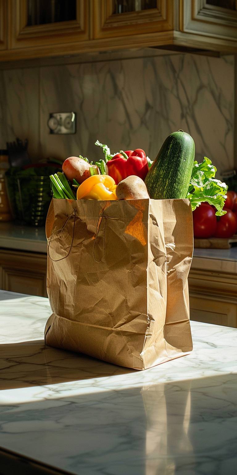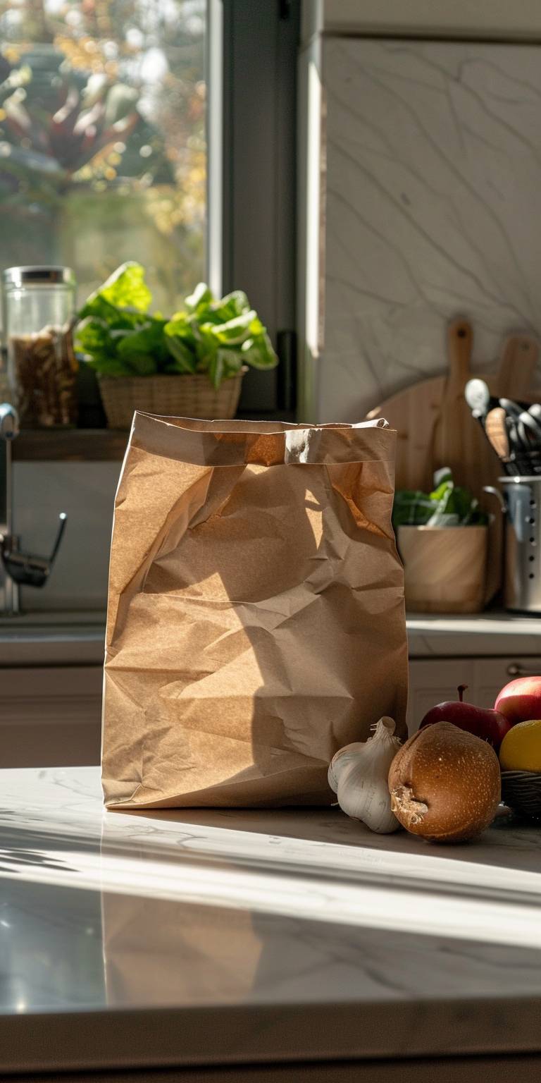 Brown rigid wrinklefree kraft paper bag of groceries on kitchen counter shot in studio. Shot using a Hasselblad camera, ISO 100, Hard shadow, Clean sharp focus --ar 1:2 --v 6.0
