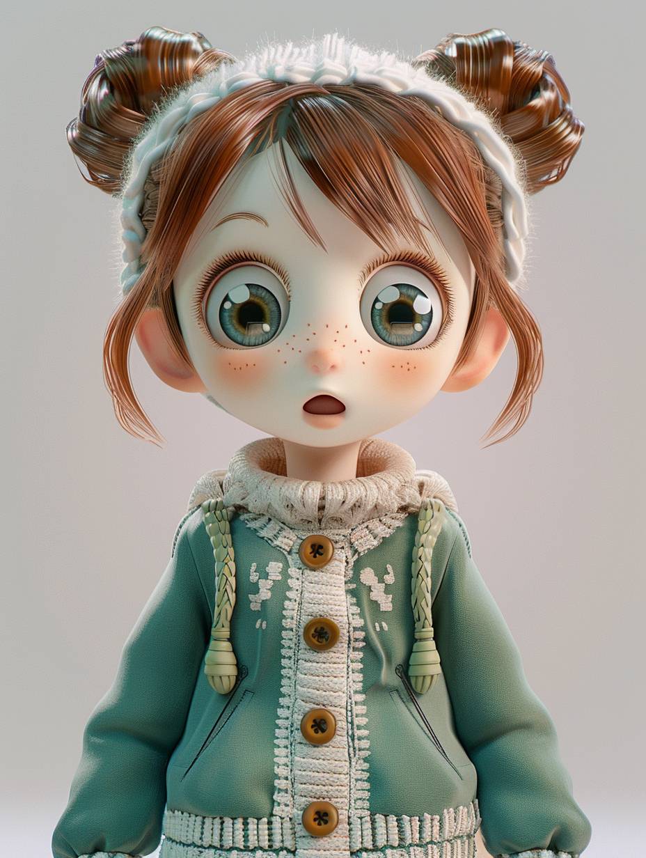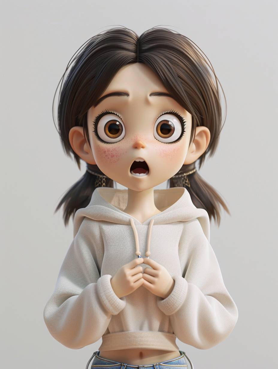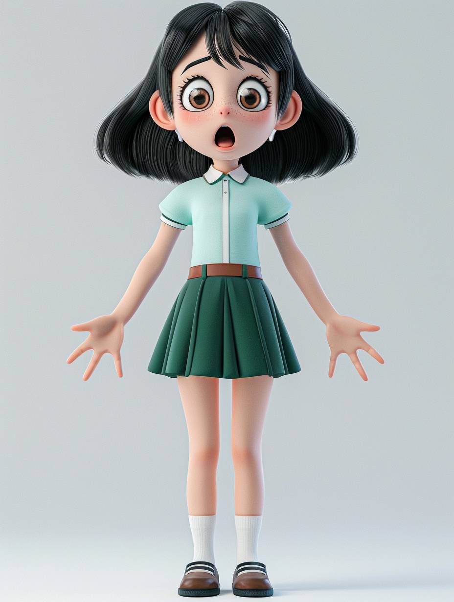 3d rendering of cute anime girl with big eyes, surprised expression, full body shot, Pixar style, high resolution, high detail --ar 3:4 --v 6.0 --style raw