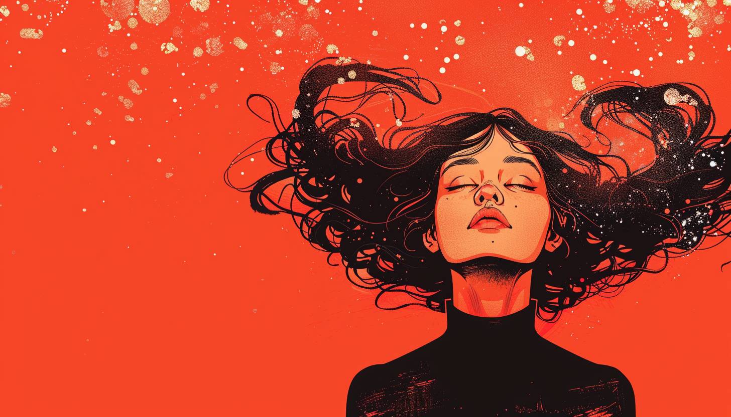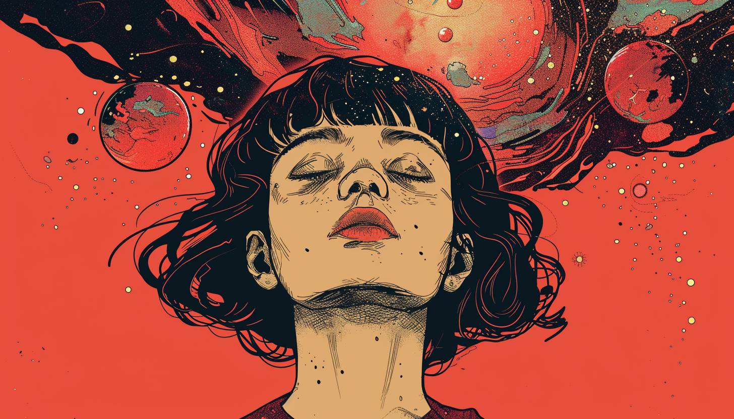 Una ilustración en estilo cómic de una chica con los ojos cerrados y cabello corto y fluido, intentando entender el conocimiento del universo, con un fondo rojo plano.