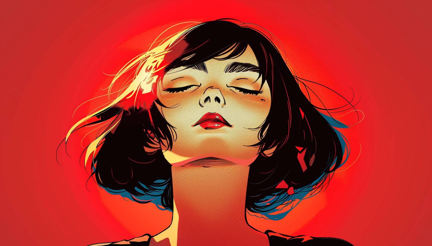 a comic book style illustration of a girl with eyes closed and short flowing hair attempting to understand the knowledge of the universe, plain red background, --ar 7:4 --v 6.0