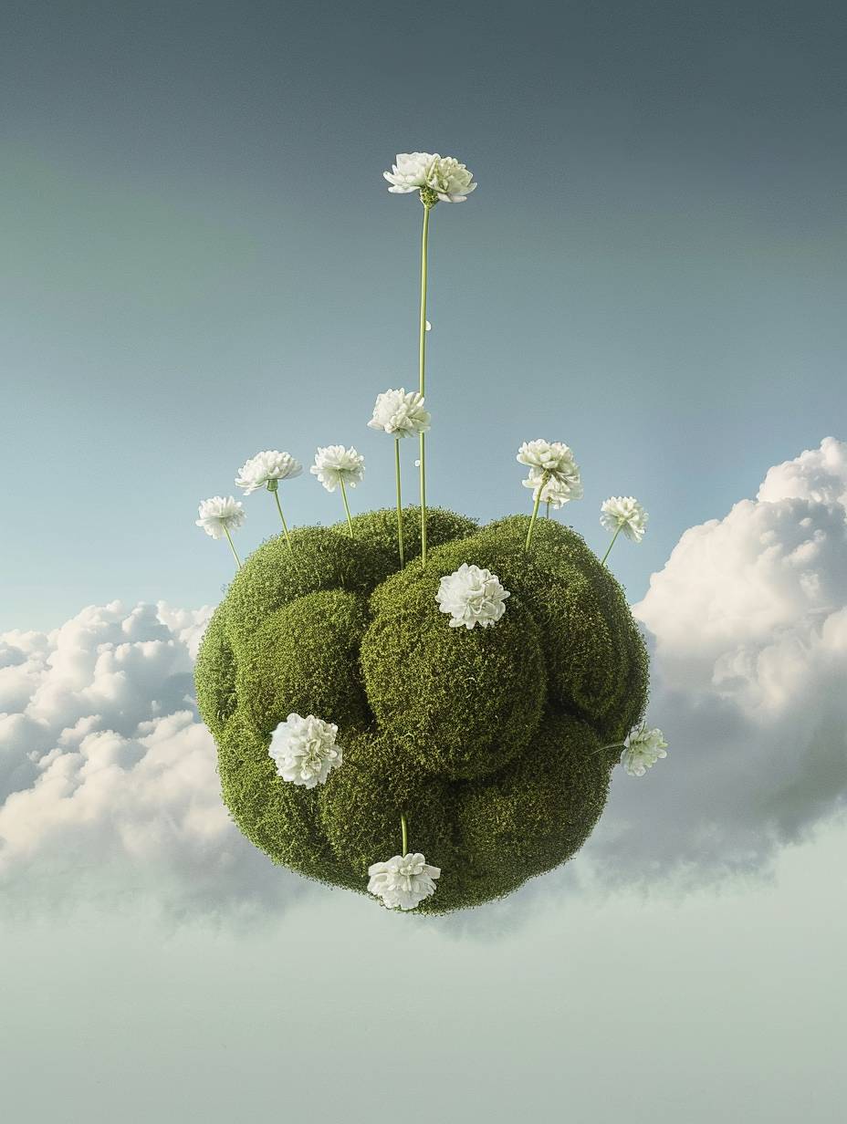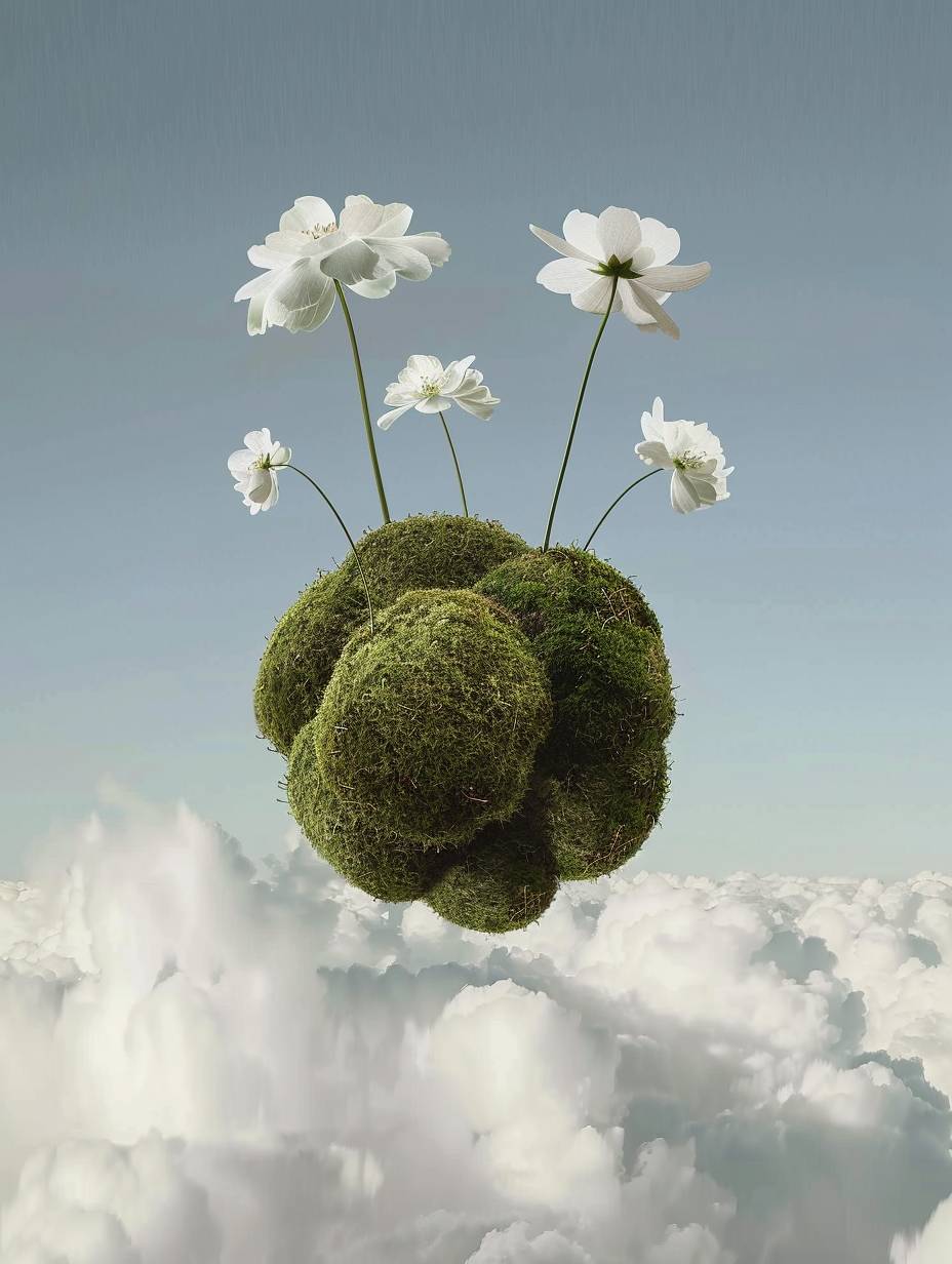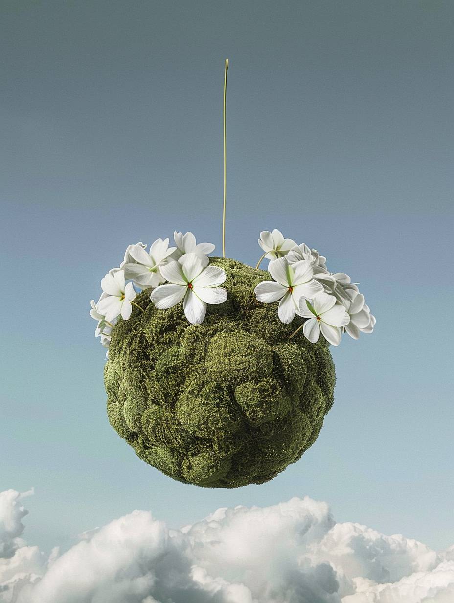 <https://s.mj.run/ldYbcXmwez8> the ball hangs in the air, the ball is covered with moss, microgreens and white flowers grow from the ball, sky background with a cloud below, soft light, minimalist composition, hyperrealism, aesthetic photography, photographer David Newton, --ar 3:4 --v 6.0