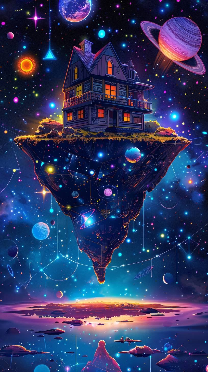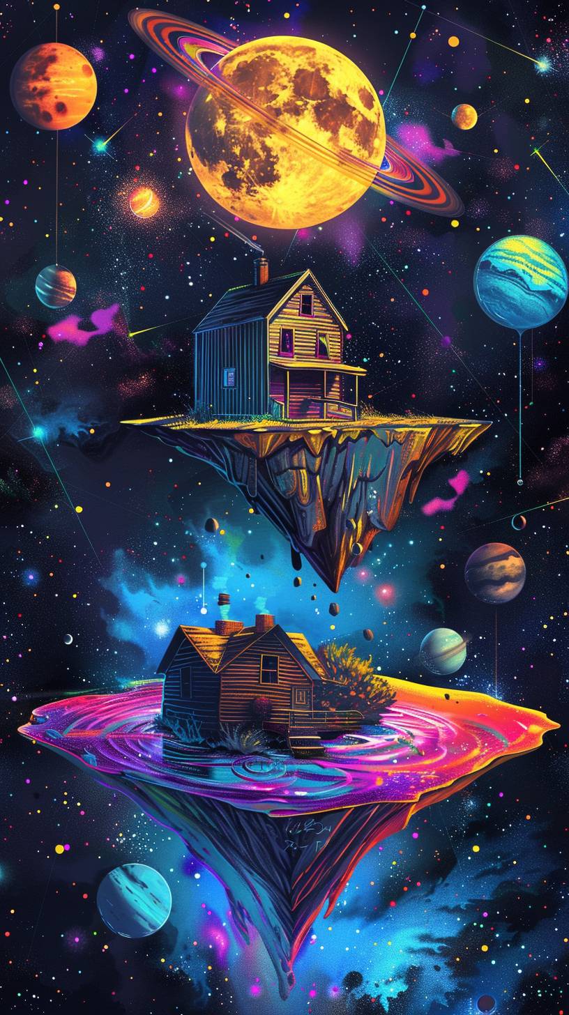 A solitary house perched on a triangle floating island amidst a vivrant cosmic landscape. The scene featues a kaleidoscope of planets, stars, nebulas that create a mesmerising backdrop. A house itself an old-fashioned, almoust rustic structure. The background is black light poster style with neon colors, stars in space and suns and moons above it, cosmic design elements. The whole scene has psychedelic vibes, with a dark blue color scheme. There are also other celestial bodies floating around. A magical atmosphere surrounds everything. It feels like being on another planet. High resolution, more details.It is an illustration drawn with digital art techniques in the style of psychedelic art. In the style of highly detailed illustration by James Jean and Mark Ryden, high contrast colors, bright and vibrant, clean lines, hyperrealistic, high definition, clean details, vibrant colors --ar 9:16 --v 6.0