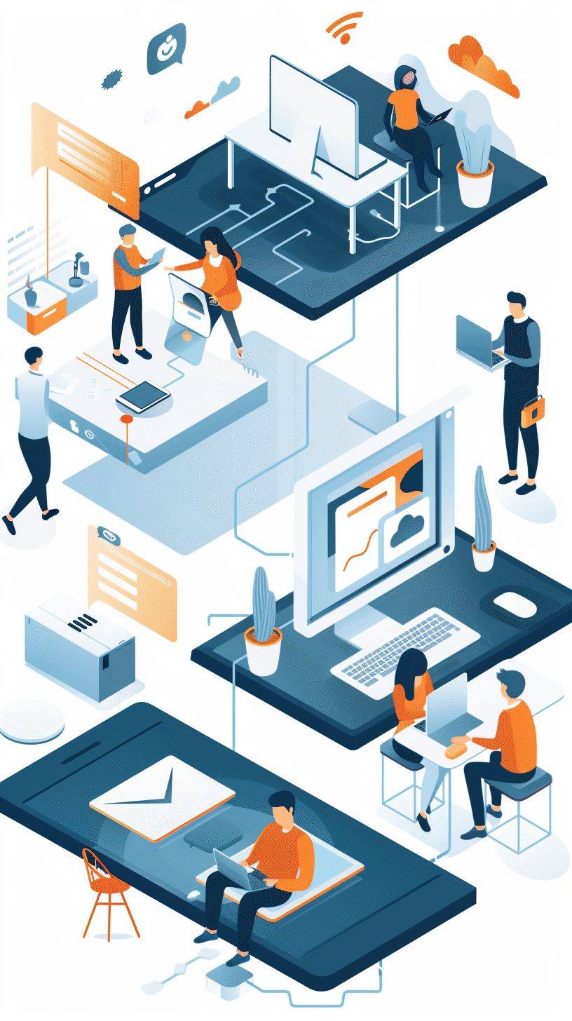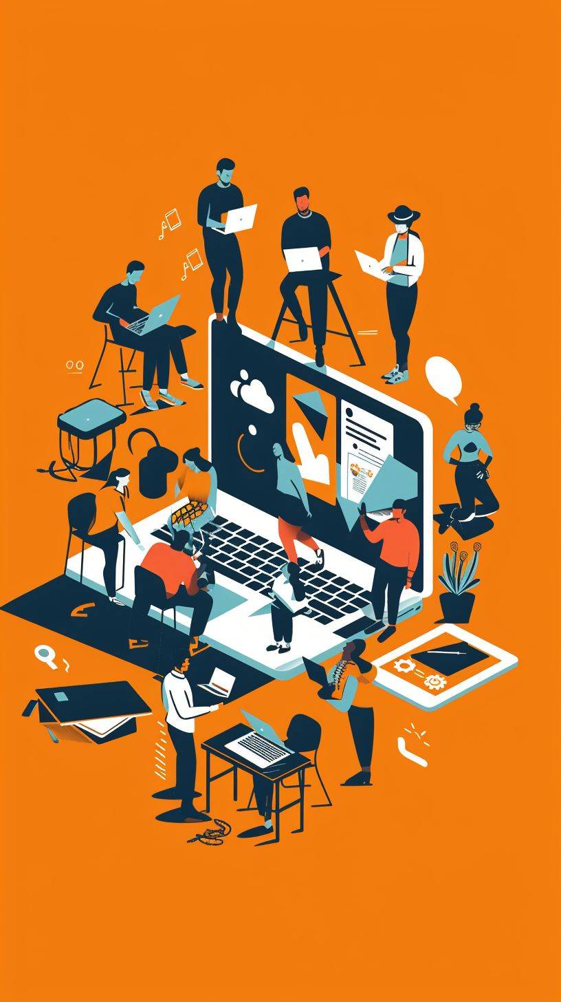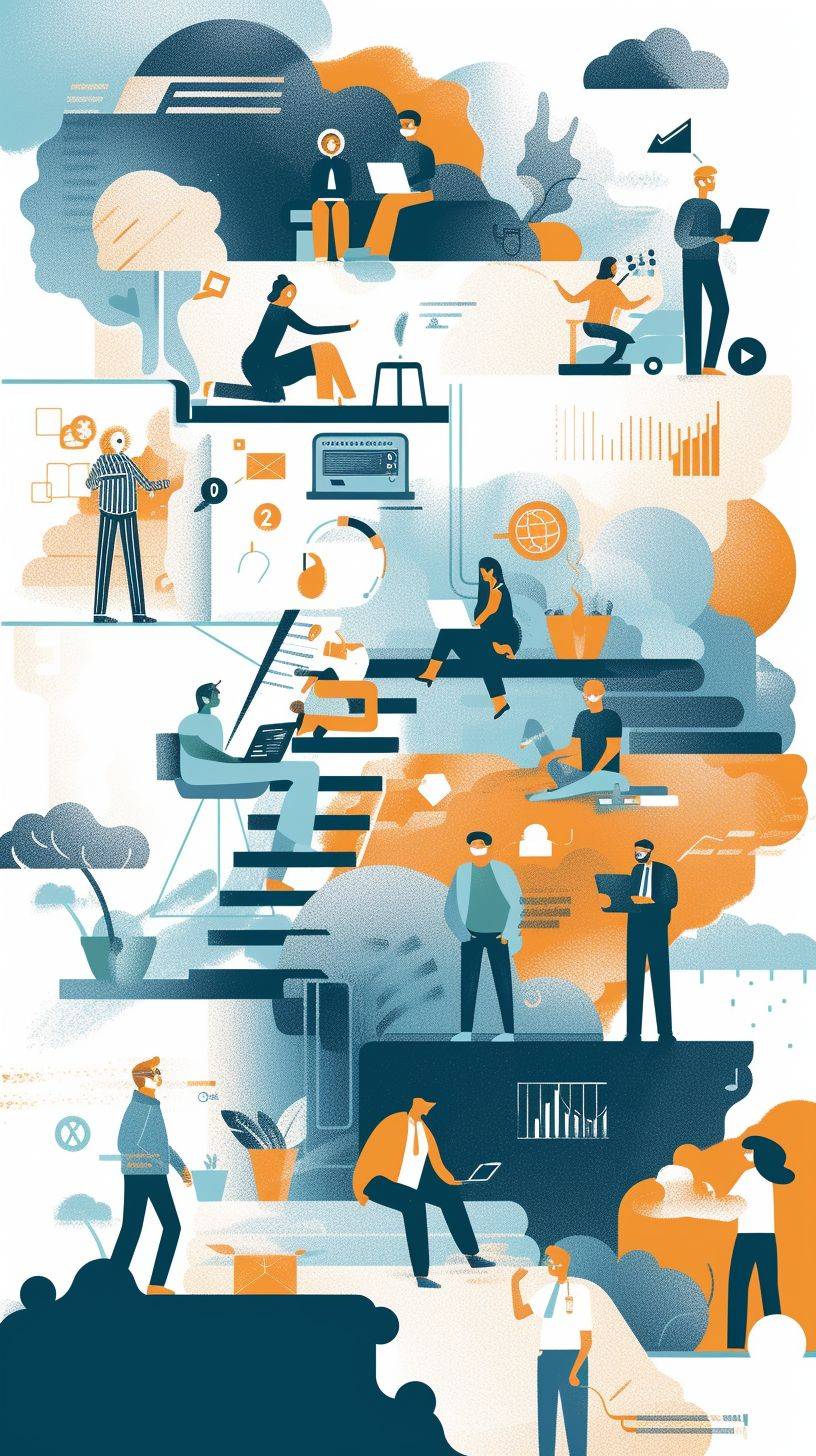 Ilustración minimalista de startup, con personajes realizando acciones relacionadas con la tecnología.