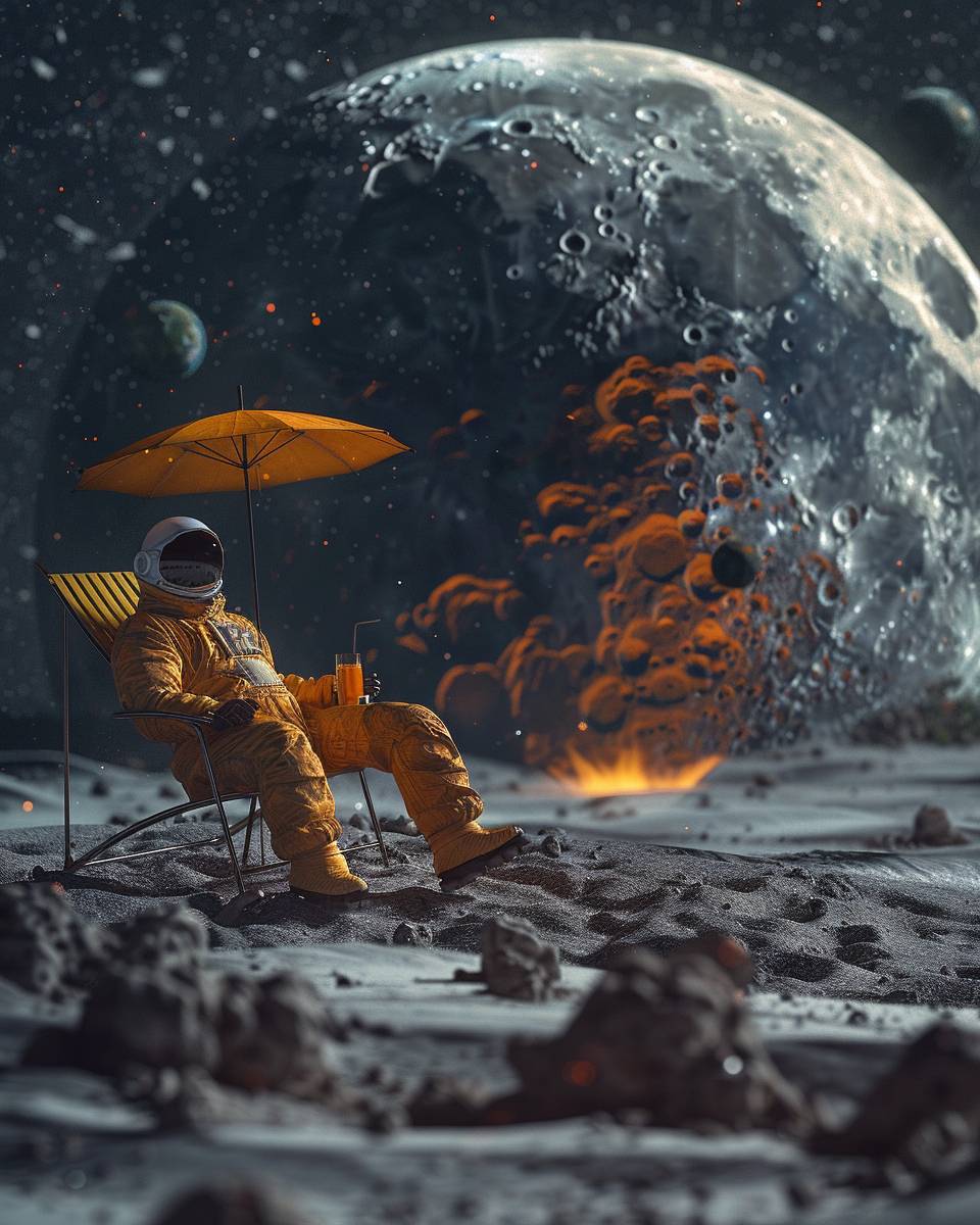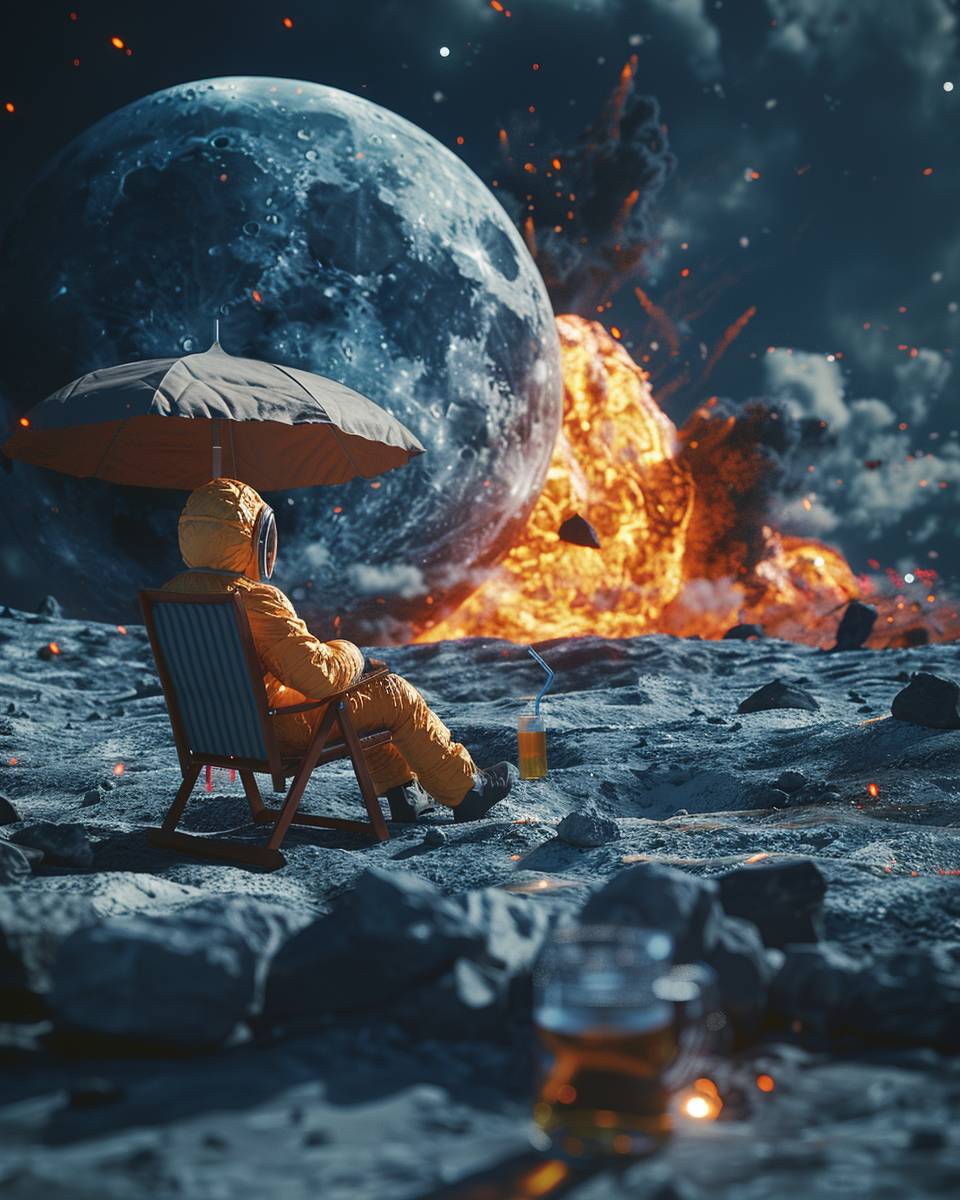 Un hombre en un traje de protección se sienta en una silla de playa en la luna, observando la explosión de la Tierra.