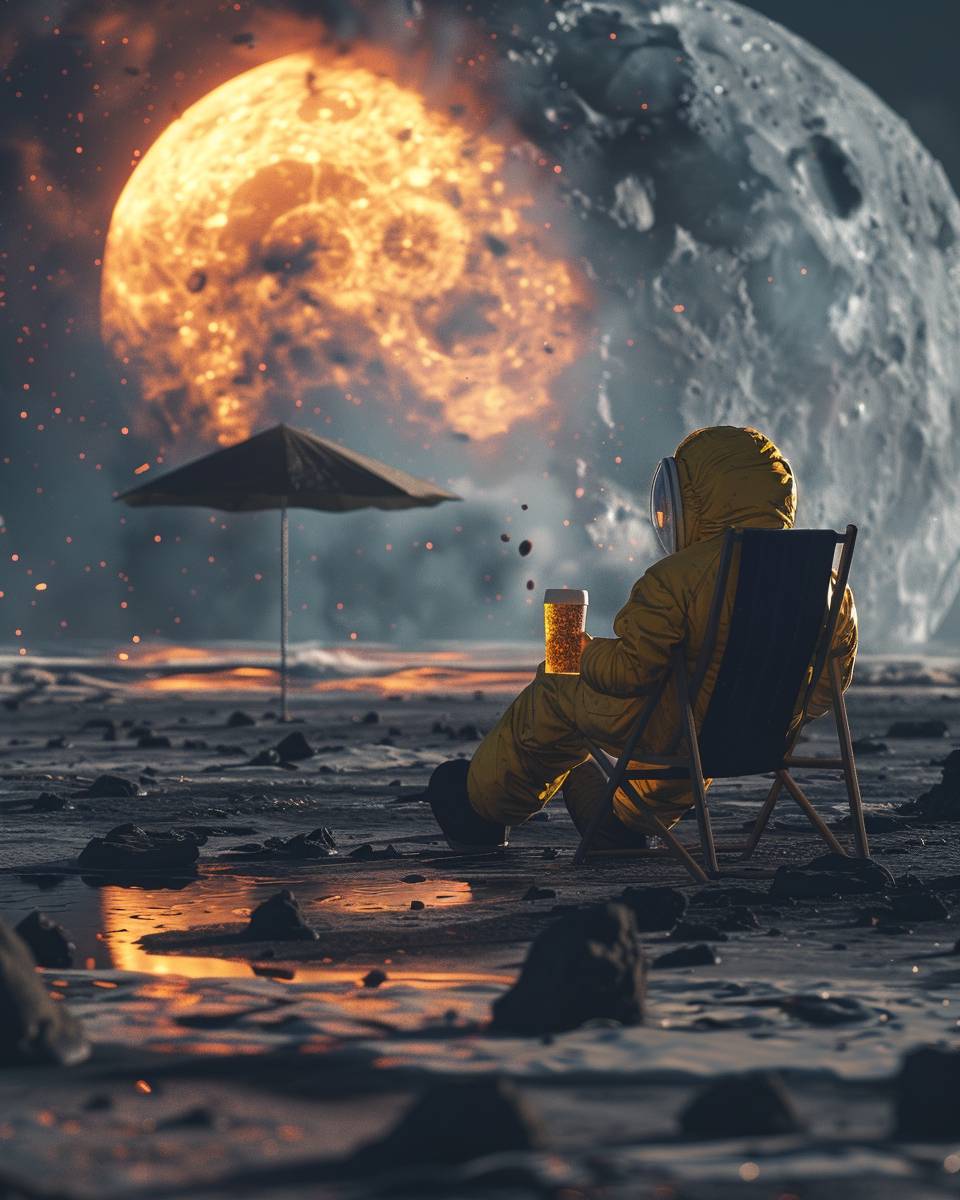 man in hazmat suit sitting on a beach chair on the surface of a black and blue moon, with a beach umbrella and beer, looking an exploding Earth, 3D render, cinestill --ar 4:5 --v 6.0