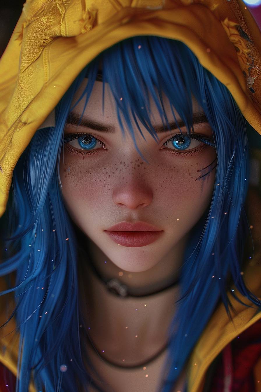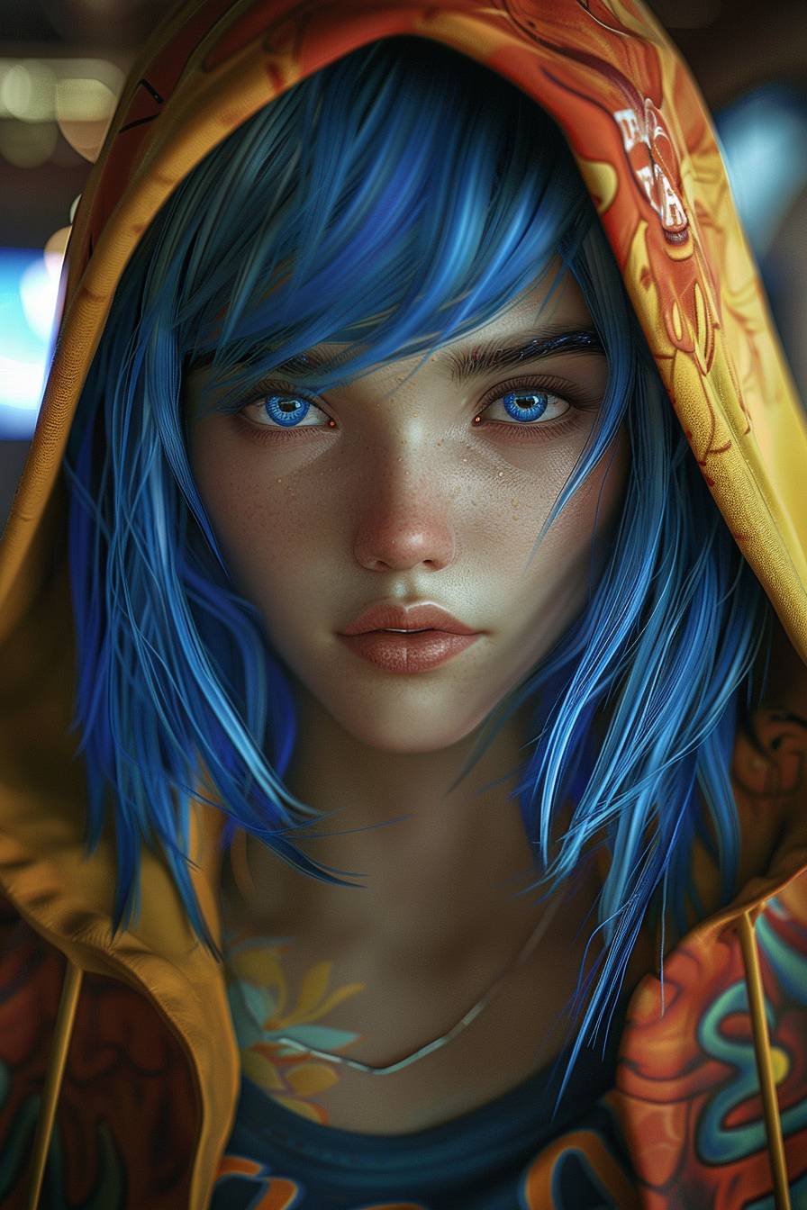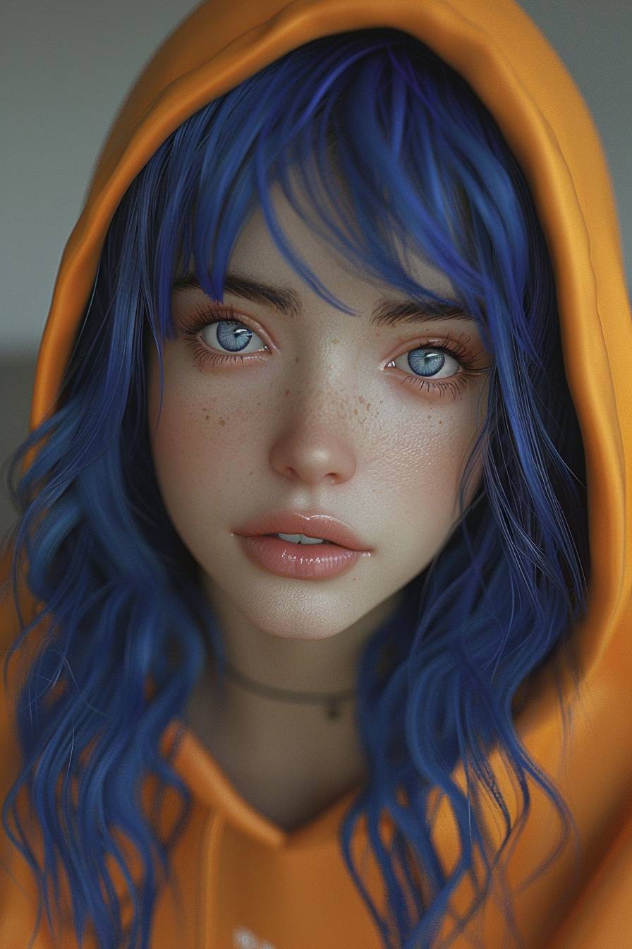 stunning anime character with waist-length cobalt blue hair, donning a vibrant hoodie, Her eyes, gentle glow, facial, Daz3D, psychedelic realism --ar 2:3 --v 6.0