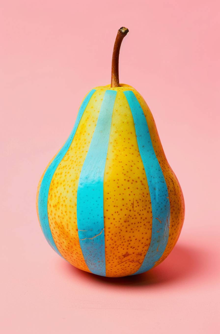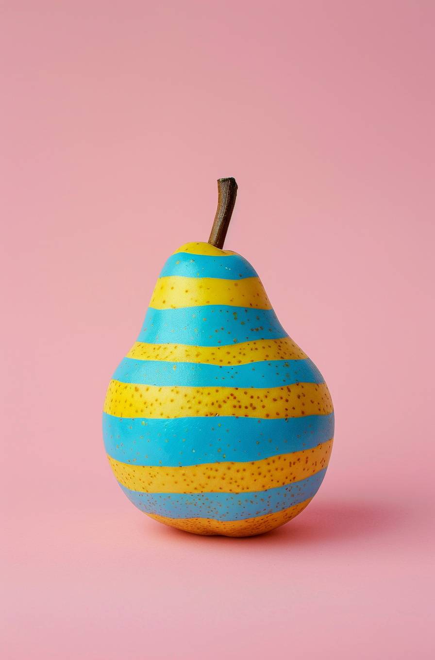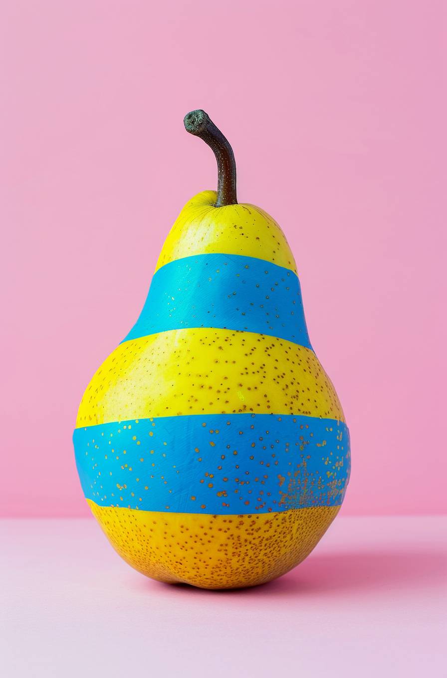 A pear with blue and yellow horizontal stripes, on a pink background, simple, minimal, with bright colors, in the style of product photography, in an advertising style, with yellow and blue stripes, colorful. --ar 29:44 --v 6.0
