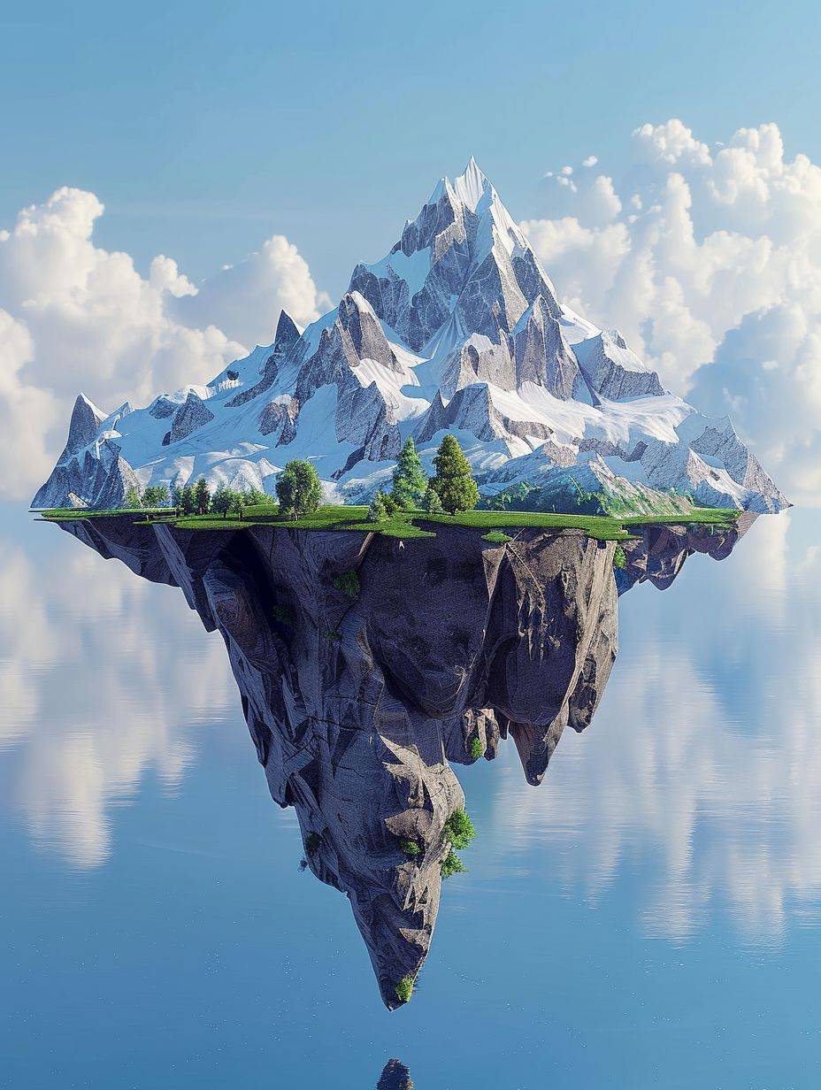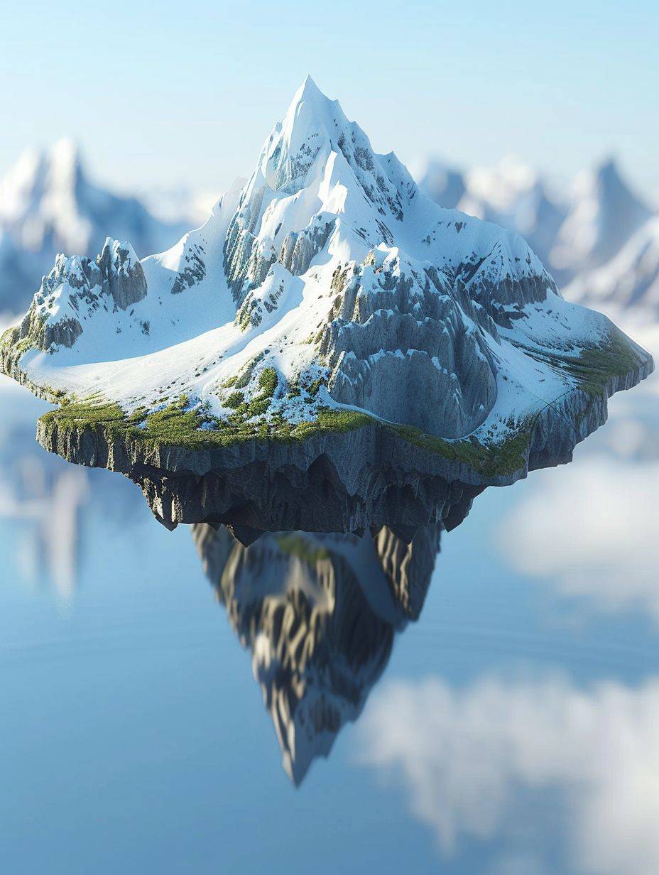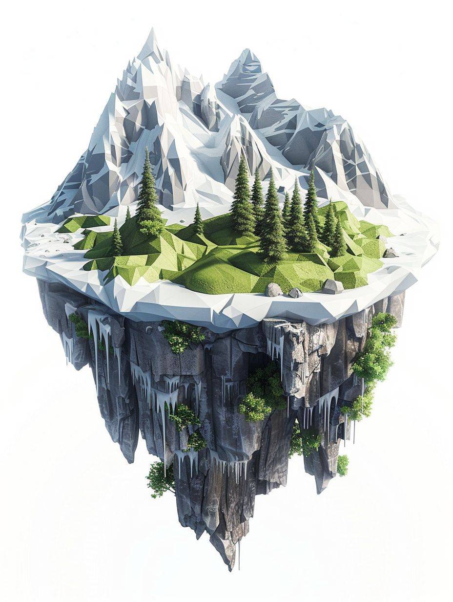 Isla pequeña suspendida con montañas cubiertas de nieve, estilo lowpoly.