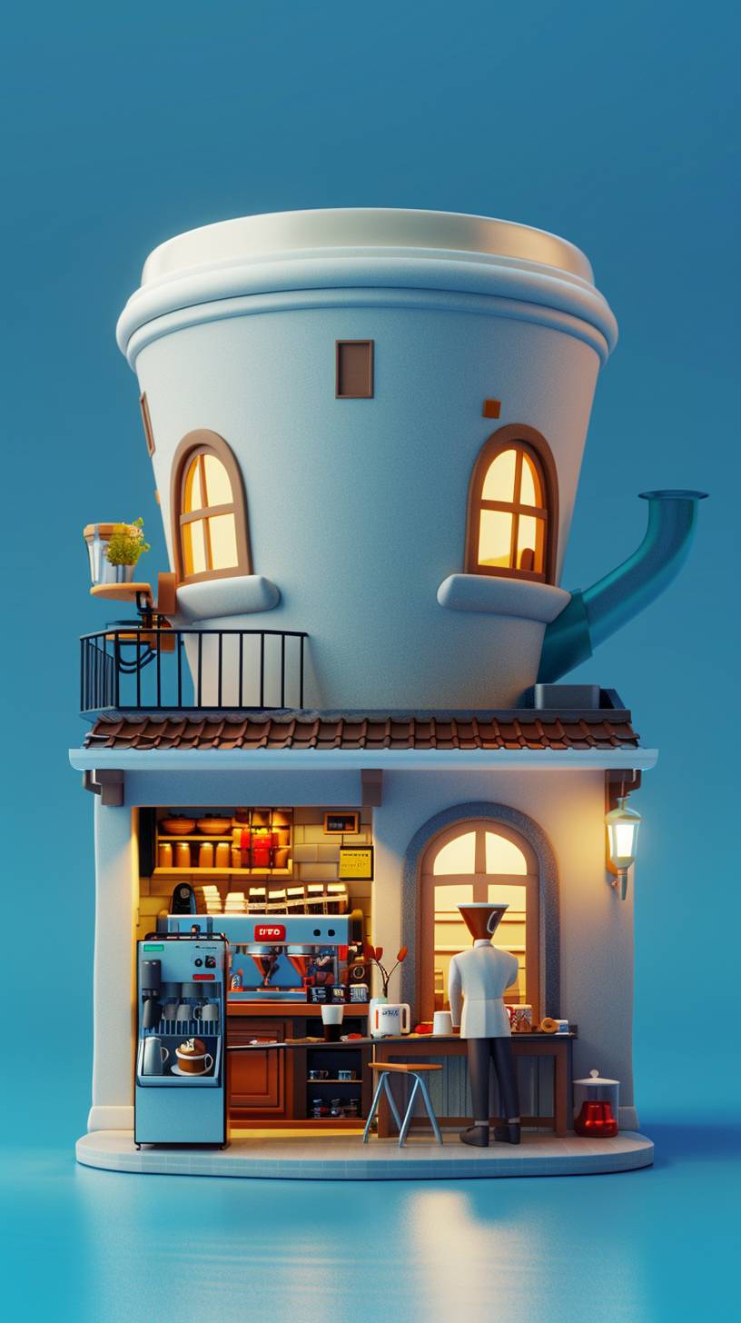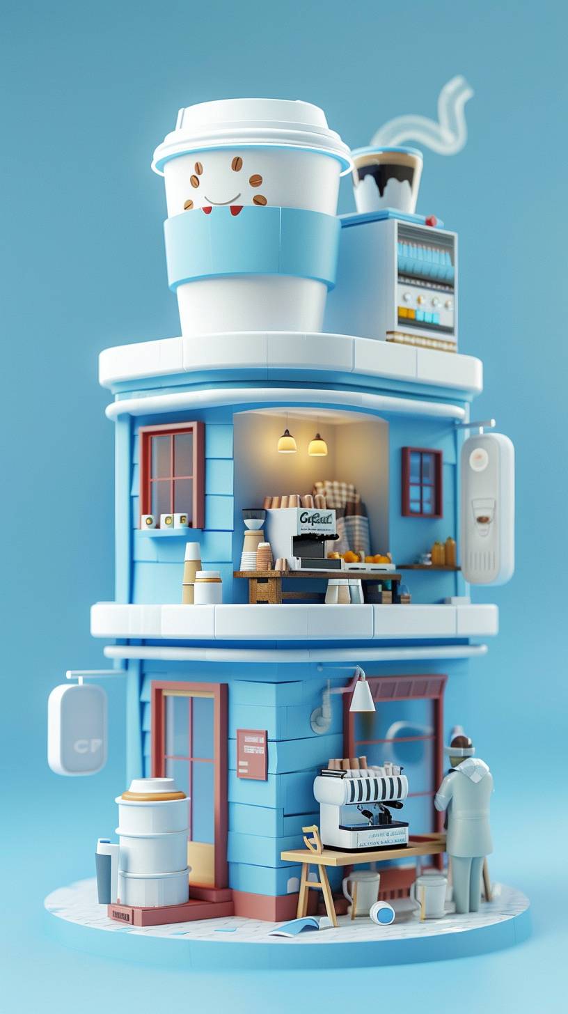 A paper cup-shaped building with a two-story coffee shop, a coffee machine on a workbench and a busy clerk, C4D modeling, UHD, high detail, high quality, white and blue background --ar 9:16 --v 6.0