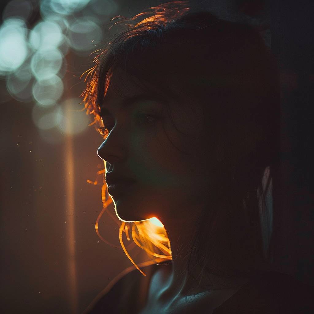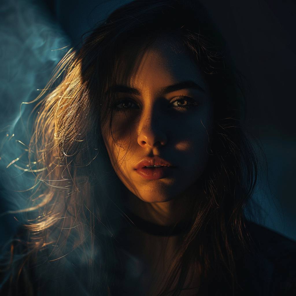 A [SUBJECT] against a dark background with a mysterious atmosphere and cool color tones with soft side lighting in the portrait photography style of high contrast between light and shadow, glow effect. light leak, bokeh --v 6.0