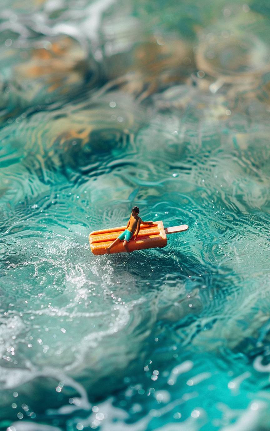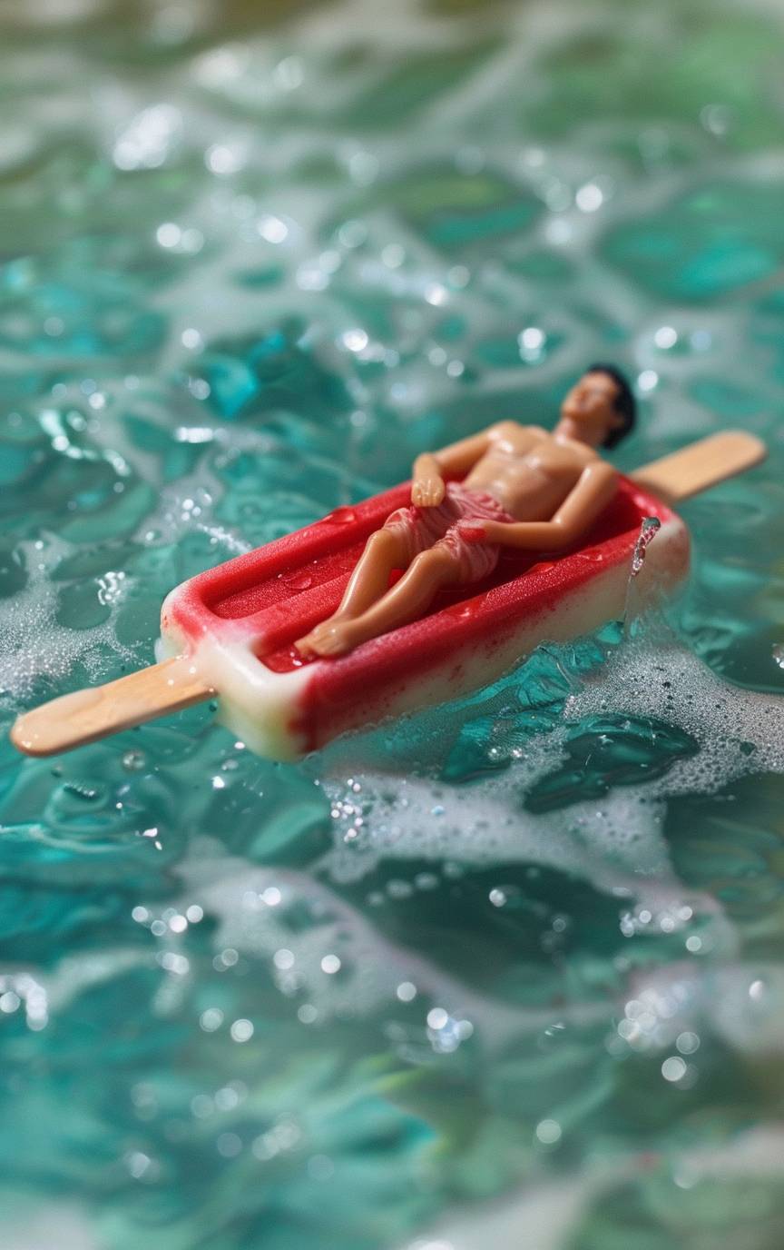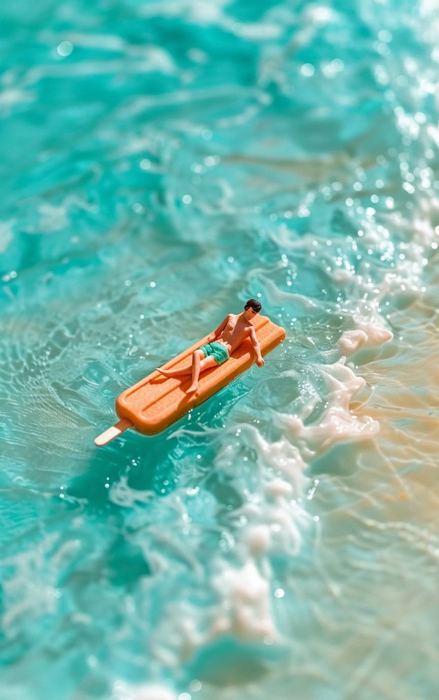 Miniature photography, clay material,Simple scene,summer posters,A man is lying on a Popsicle floating in the water,The colors naturally express the coolness of summer and the ease of life --ar 5:8 --v 6.0