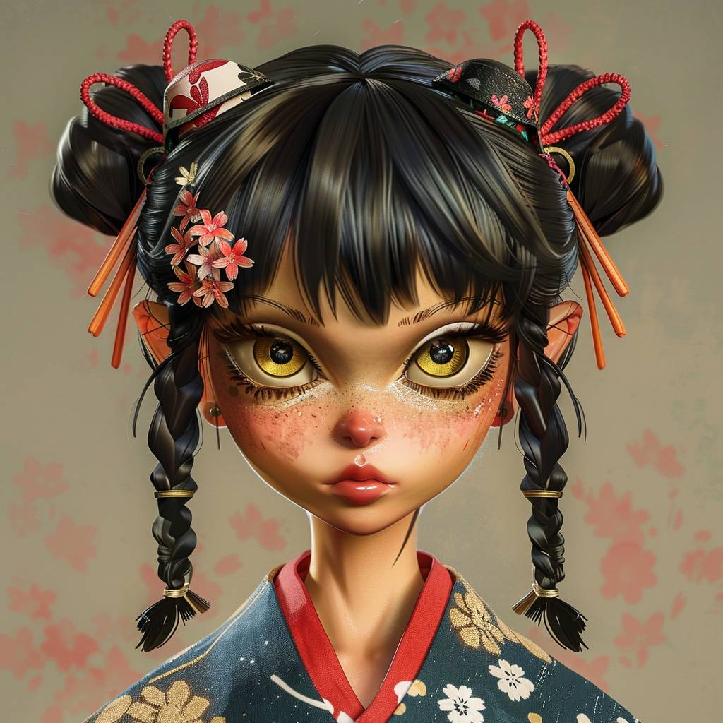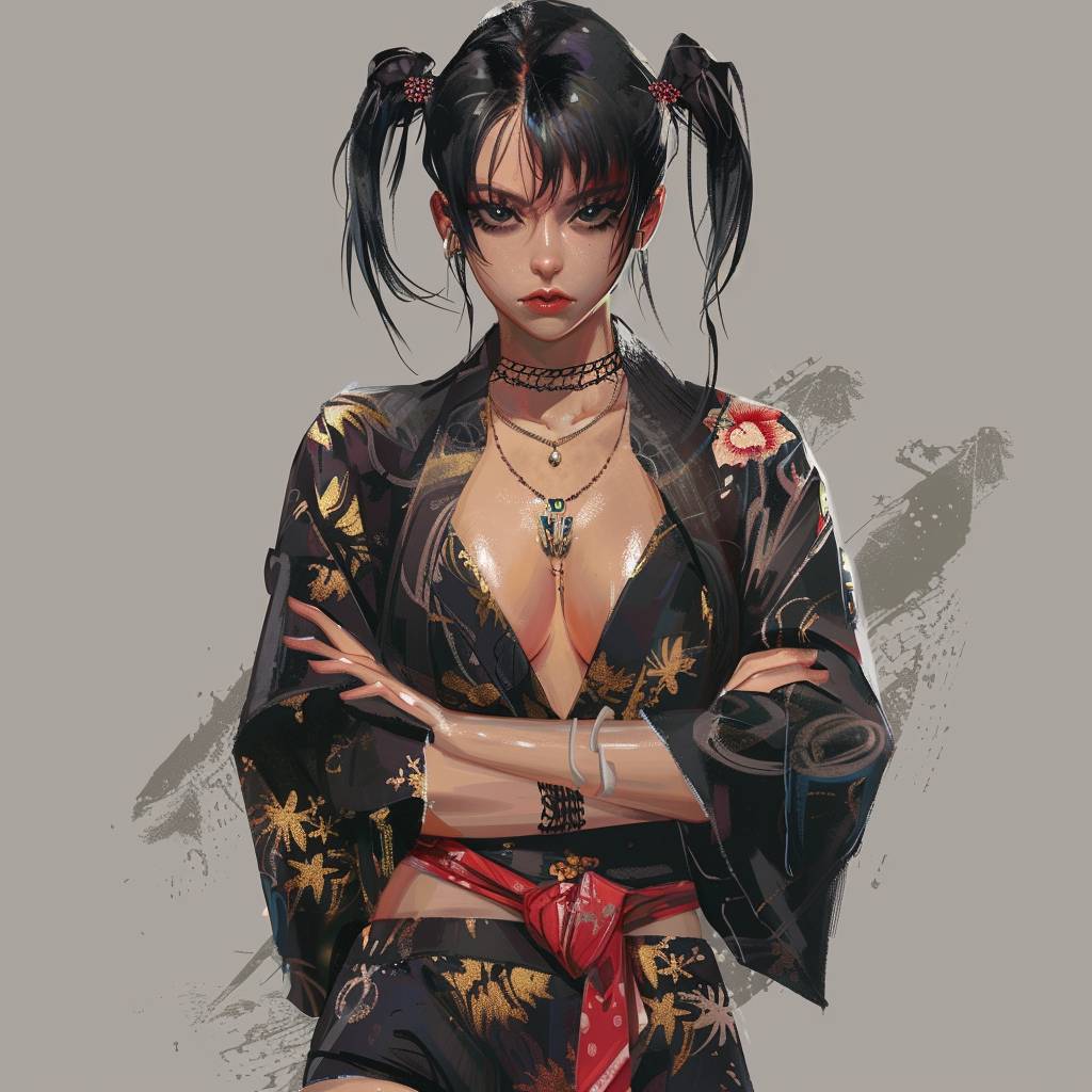 Chica de estilo Q de animal japonés, brazos cruzados sobre el pecho, cabeza ligeramente levantada, ojos bajados, con una expresión malvada.