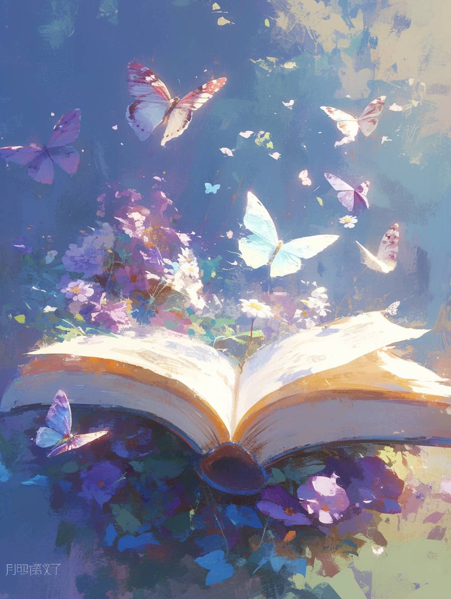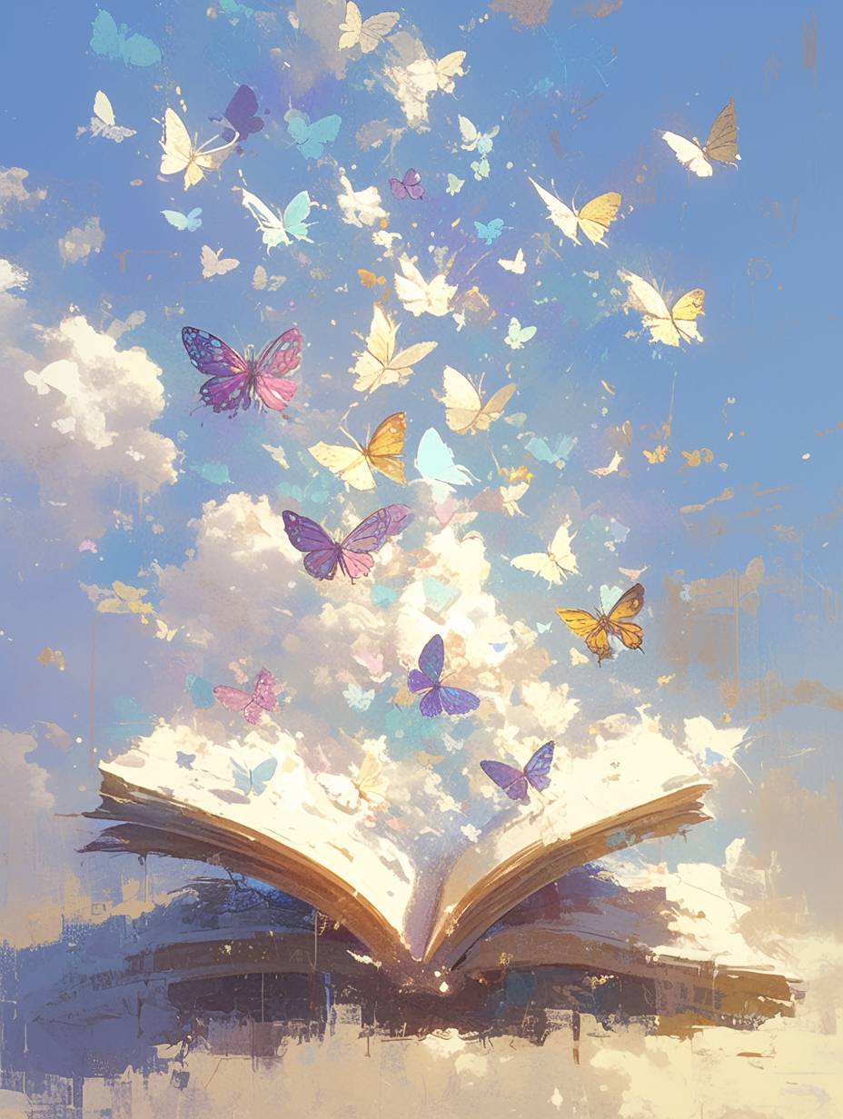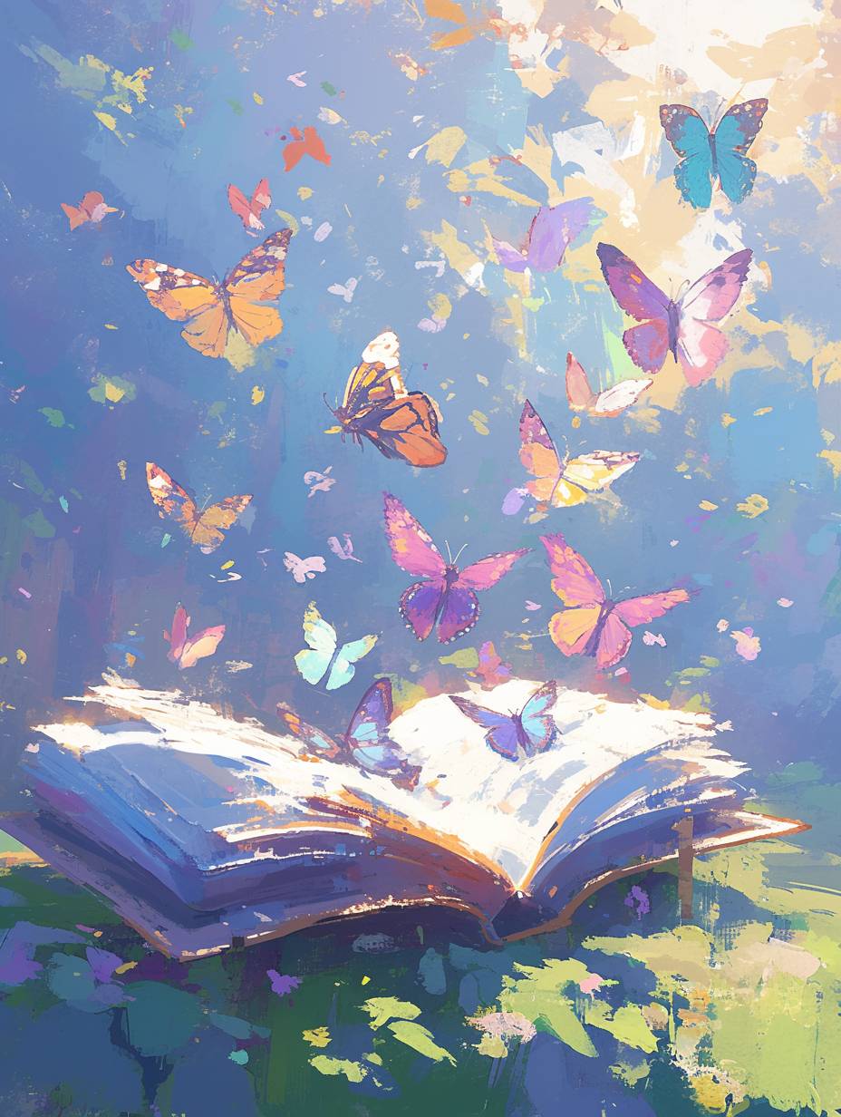 Mariposas de todos los colores salieron de un libro abierto, suave luz del sol, color de baja saturación, pintura al óleo, color de baja saturación, blanco holográfico, onírico, rico en detalles.