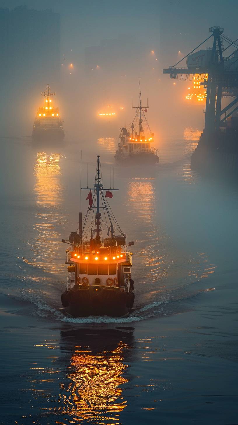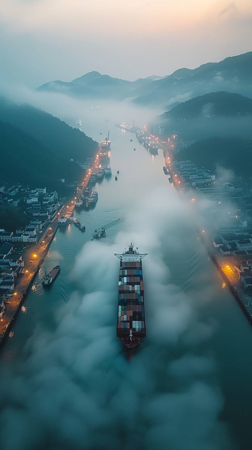 In the early morning fog, at the Chinese foreign trade port, there are cargo ships sailing out, and the scenery is beautiful --ar 9:16 --style raw --stylize 300 --v 6.0