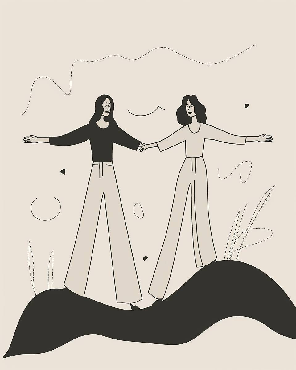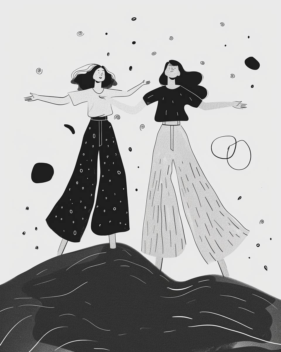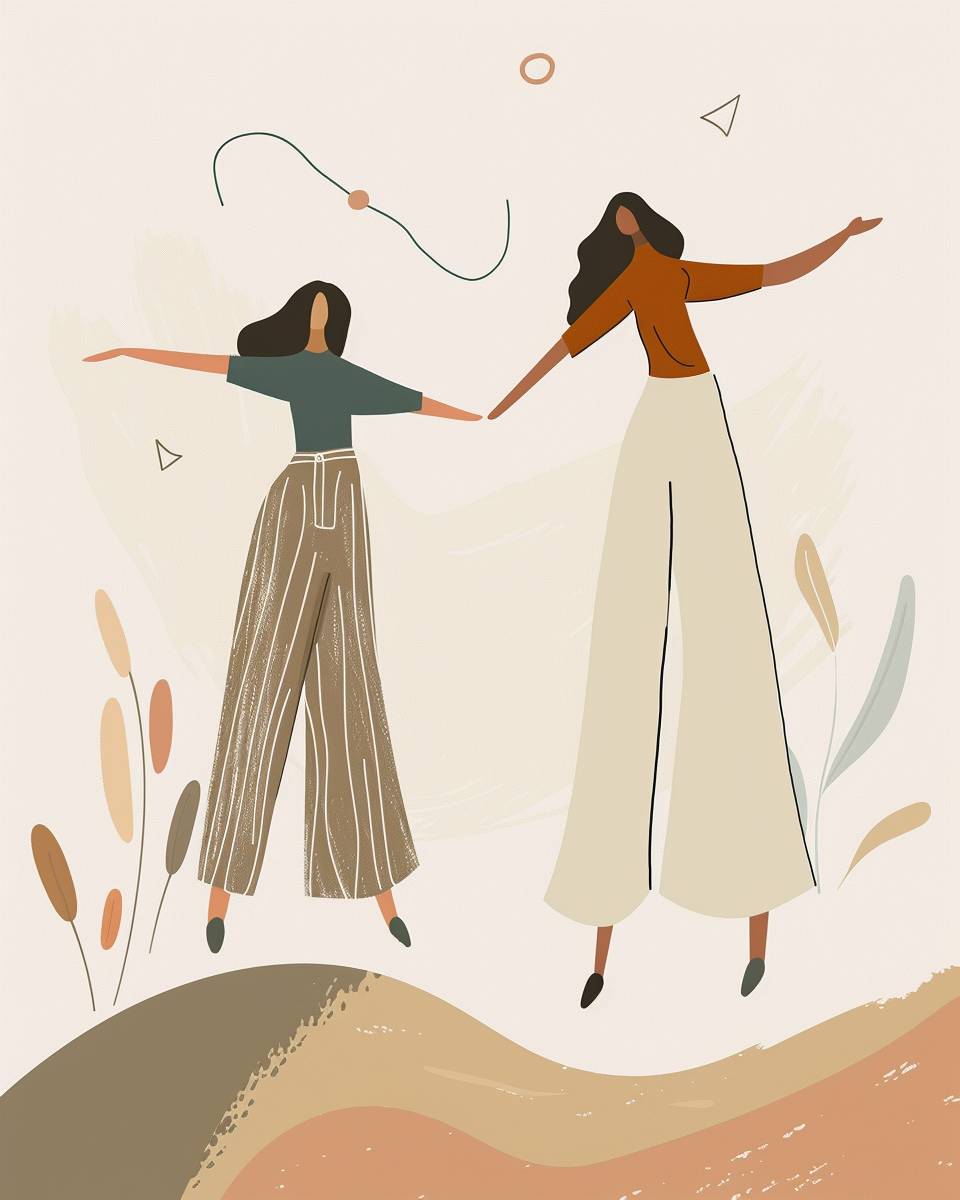 two women with spreading and welcoming arms standing on the mild hill, representing friendship and solidarity, full body, dressed in wide pants, a little abstract shapes floating around, 2d corporate minimal, corporate flat, outlined, monochromatic, textured illustration --no background, gradients --ar 4:5 --v 6.0