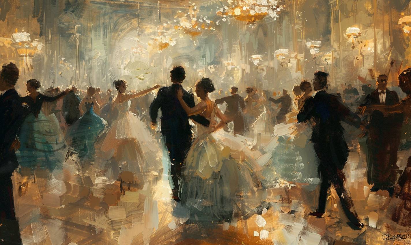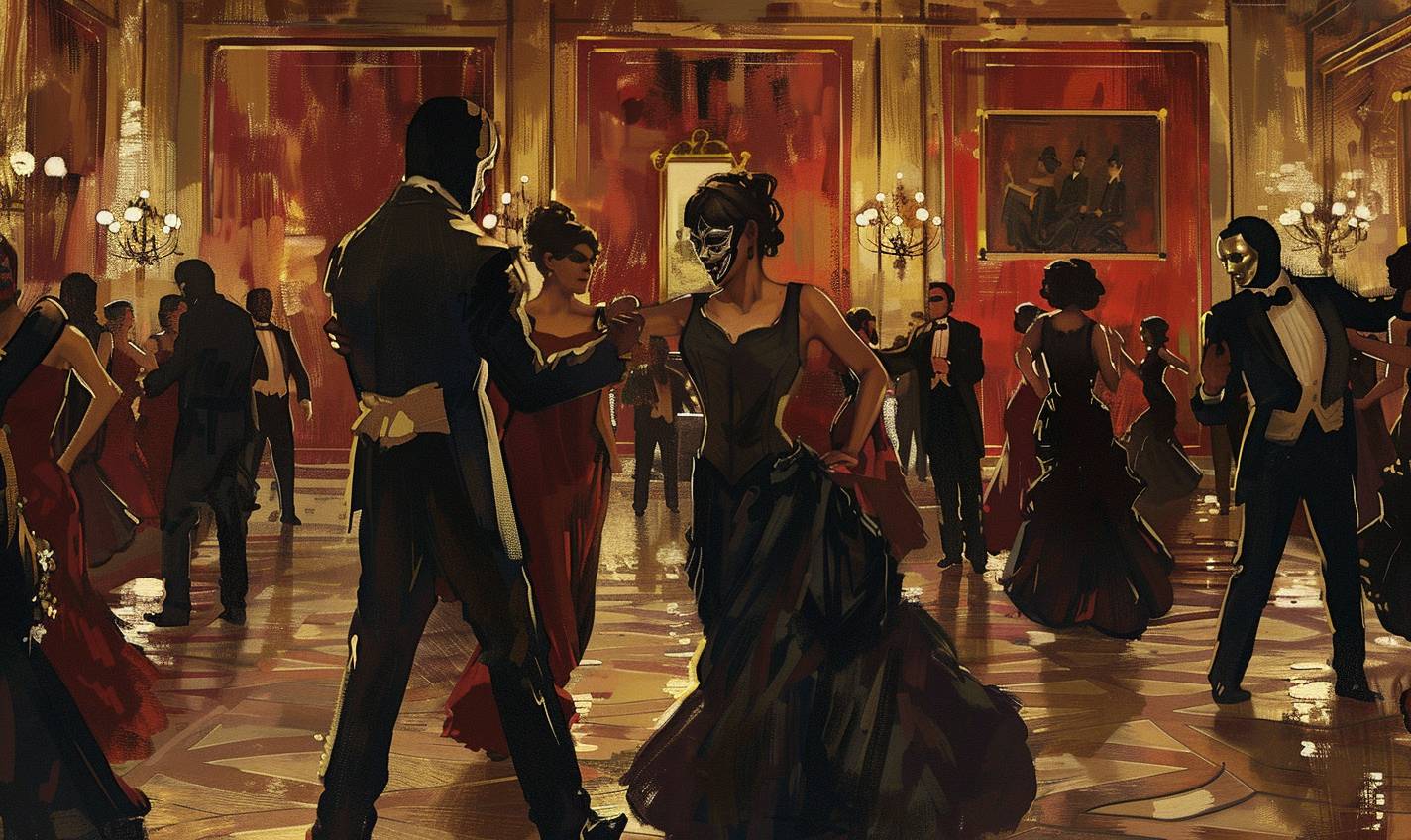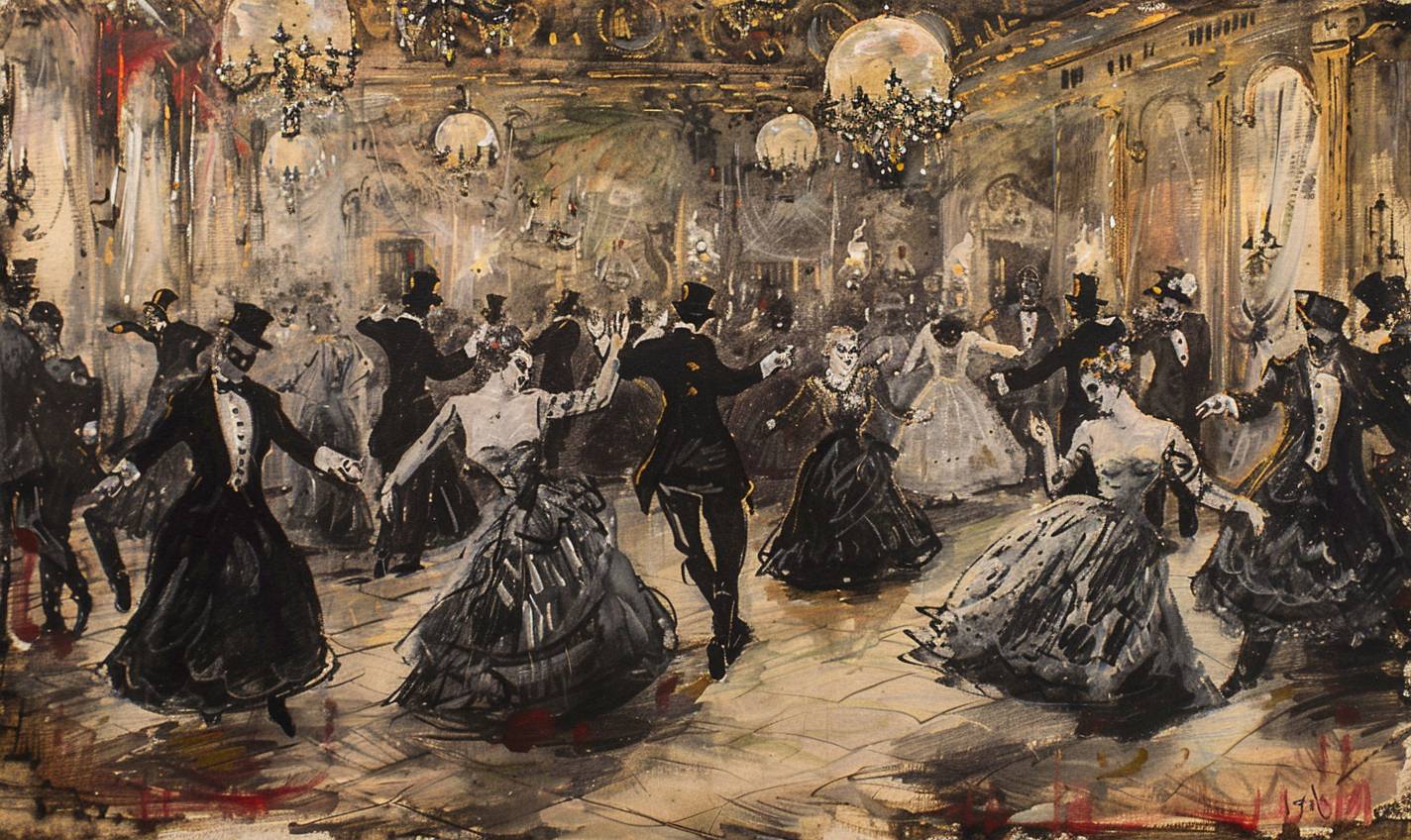 Un elegante salón de baile lleno de bailarines enmascarados