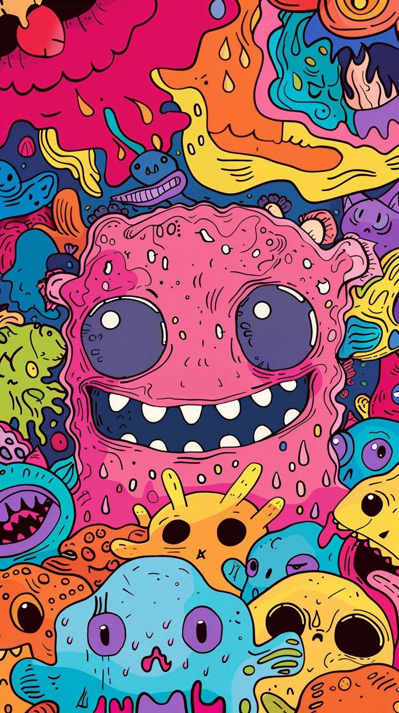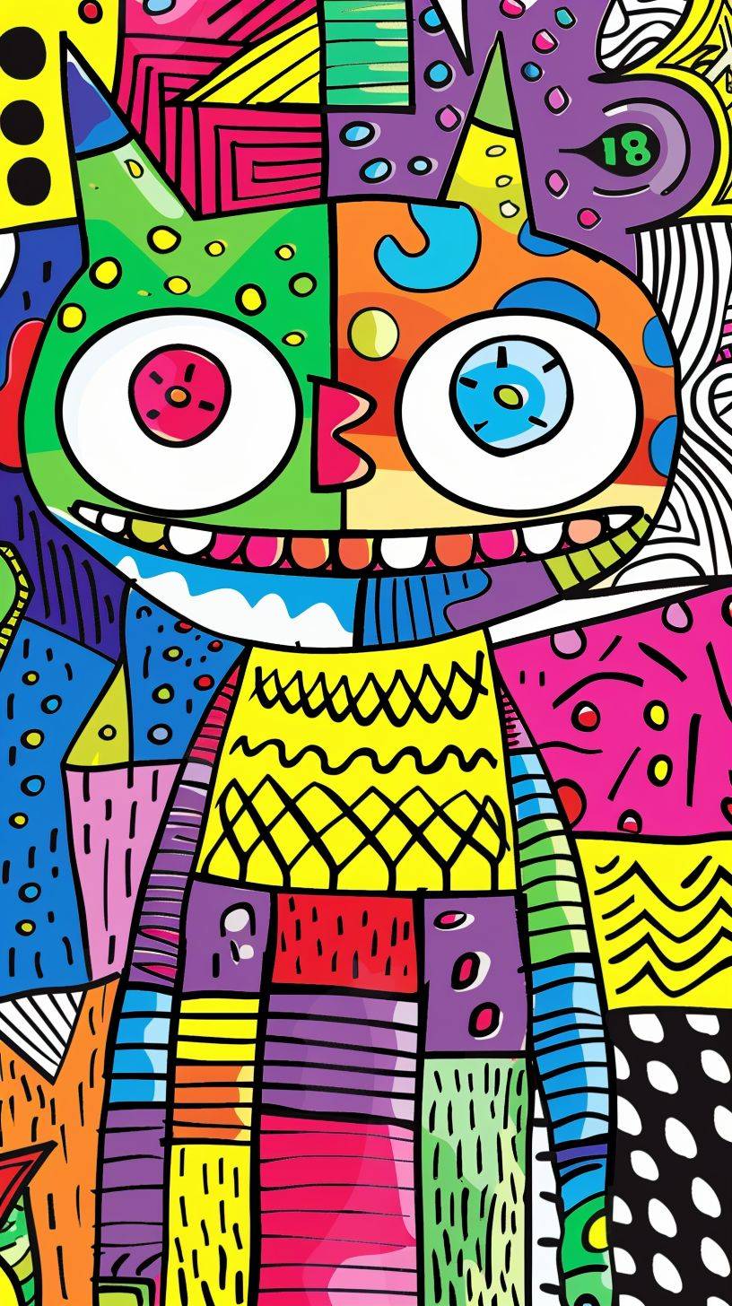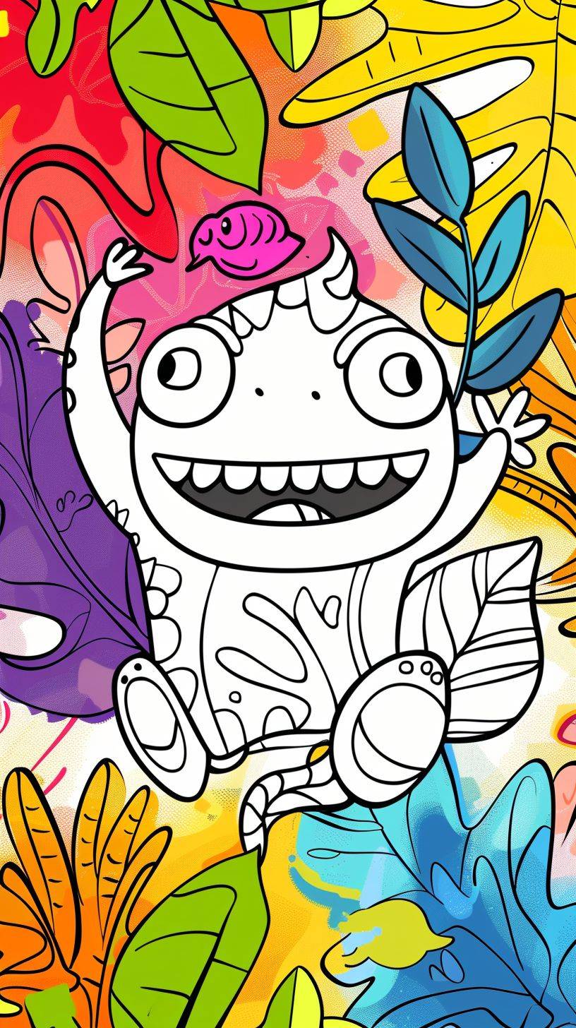 "A coloring page with simple lines and no background, featuring a cute monster. The background of the page is filled with vibrant colors and children's books for ages four to six.--chaos 15 --style raw --ar 9:16 --stylize 150