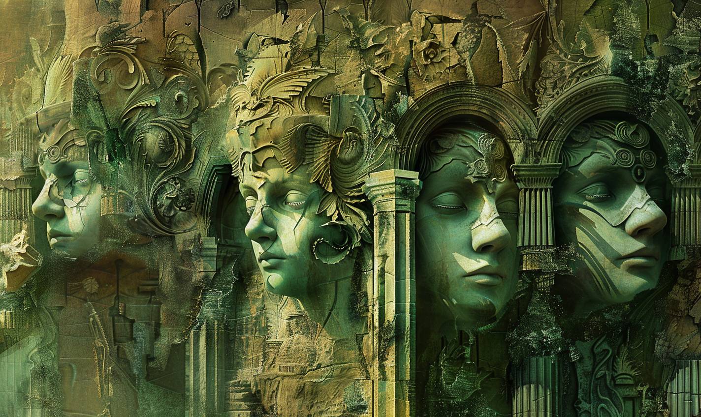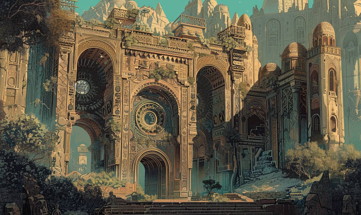 Ruinas antiguas con intrincadas tallas al estilo de Alphonso Mucha