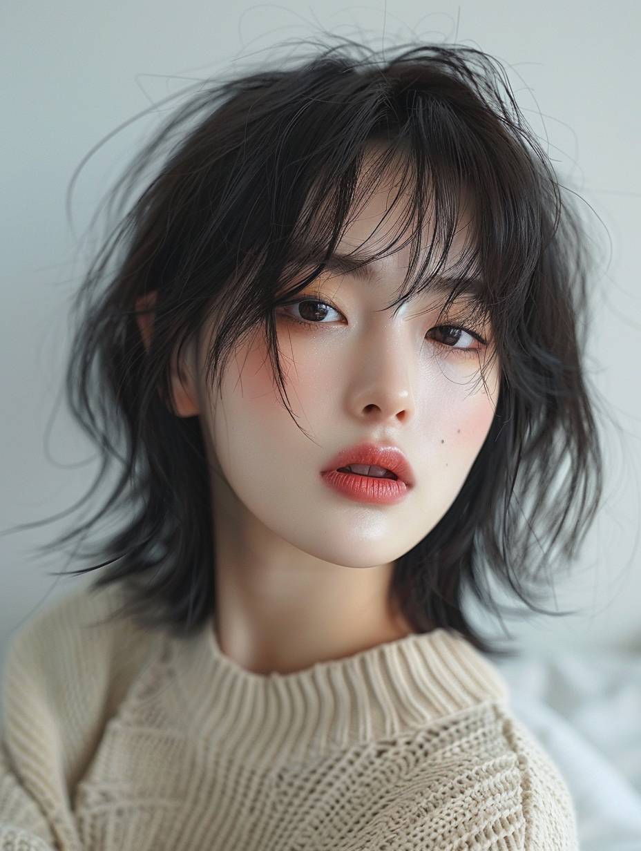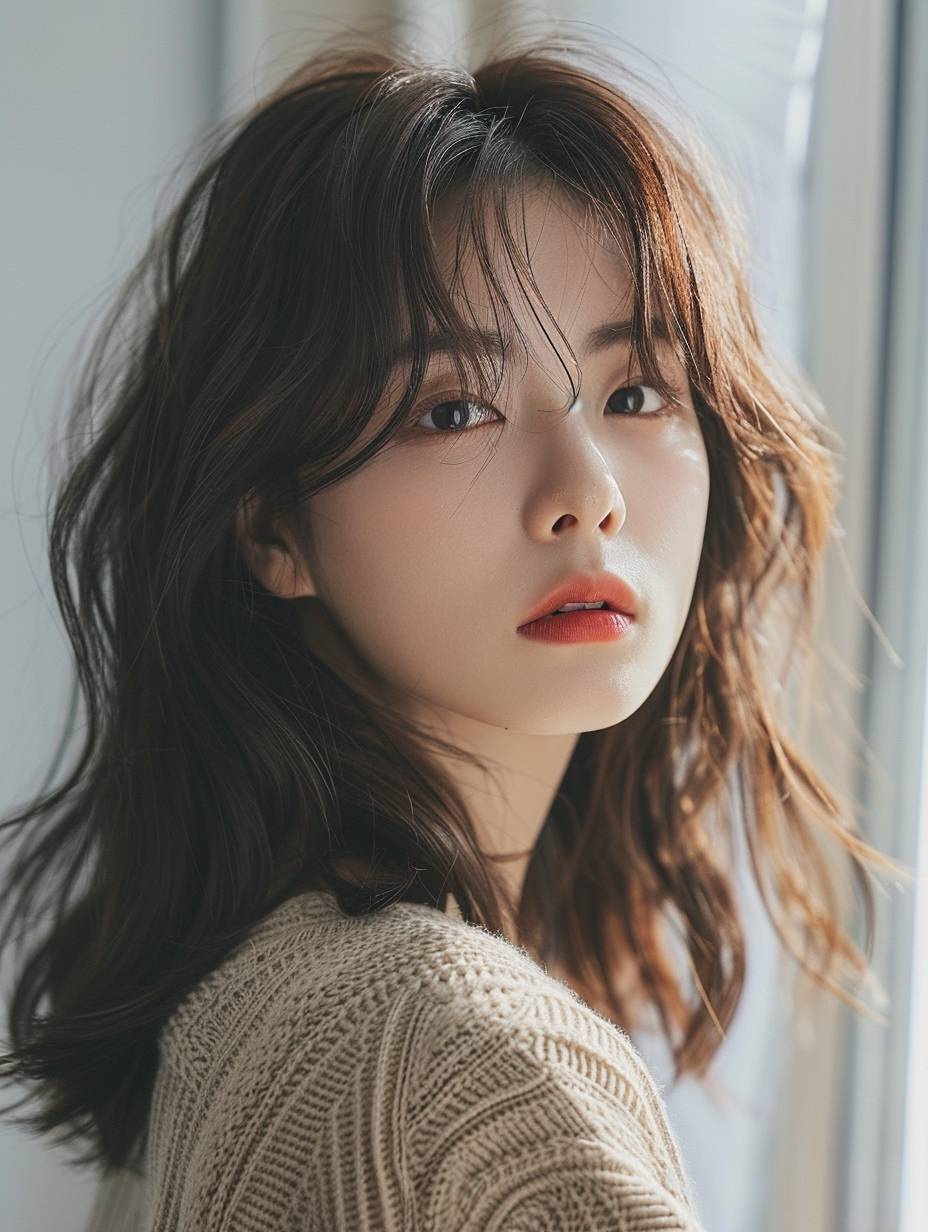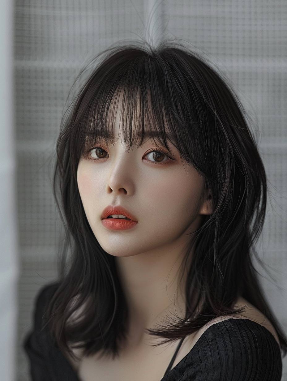 Her hairstyle is a medium style with a princess cut around the face and a Korean low layered style with straight hair and outline ends. Her hair color is milk tea and very glossy. Her bangs are thin. The girl has a pale, pretty face and wears bright makeup. The girl is a K-pop vocalist in her 20s. Today we are shooting hairstyles. She is posing to show off her hair style. The background is white stylish wallpaper. SLR camera with single focal length lens, f/1.4, natural light. --ar 3:4 --style raw --stylize 260 --v 6.0