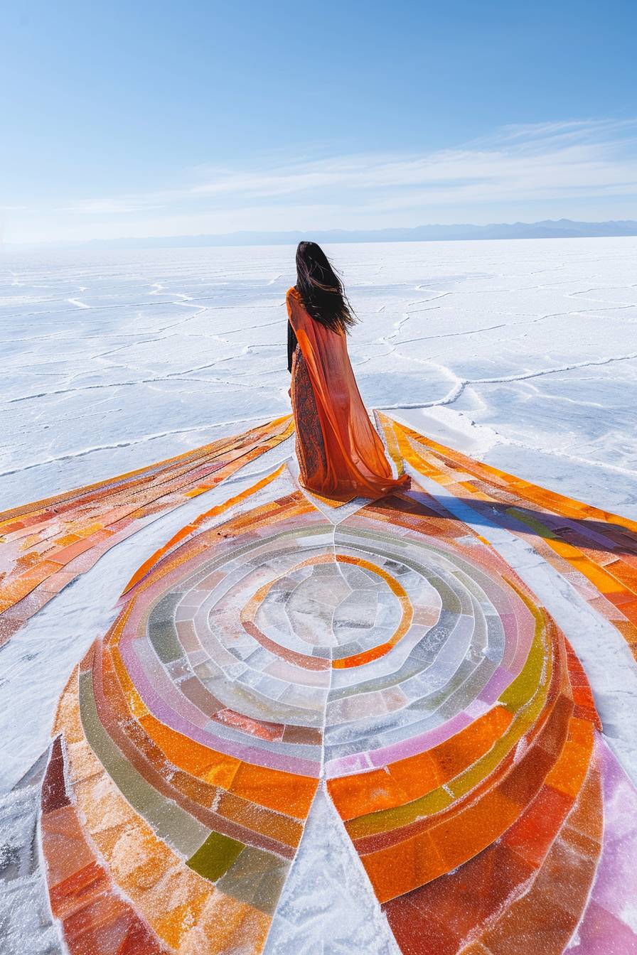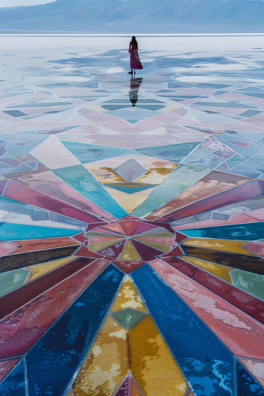 Visualize a large, reflective salt flat in Bolivia, where Graafland has created an intricate, geometric pattern using colored salt. In the center, a solitary figure stands, dressed in a flowing, brightly colored garment that blends with the artwork. This scene is shot with a Nikon Z7 II, capturing the vastness and the surreal quality of the artwork against the stark, white background --ar 2:3 --style raw --v 6.0