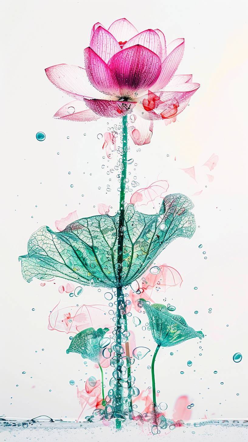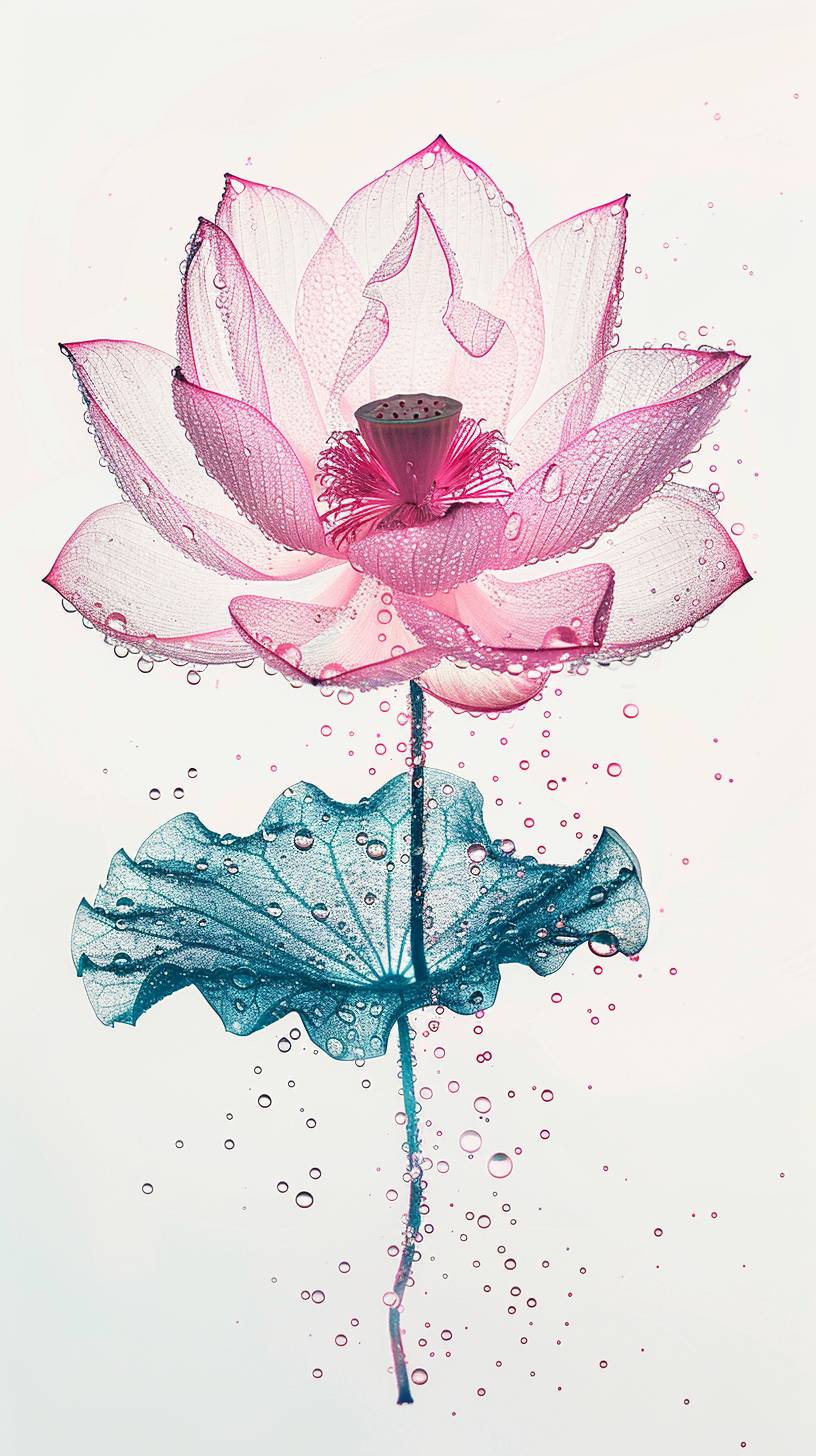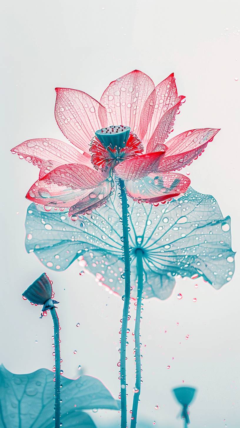 Close-up X-ray, translucence minimalist in simple white background full of water drops, Lotus flower and lotus leaf, frosted glass blur covered, multiple exposures, macro photography, soft red, photography by william fang, shot on Hasselblad x2d --chaos 1 --ar 9:16 --p b1oftln --stylize 150 --v 6.0
