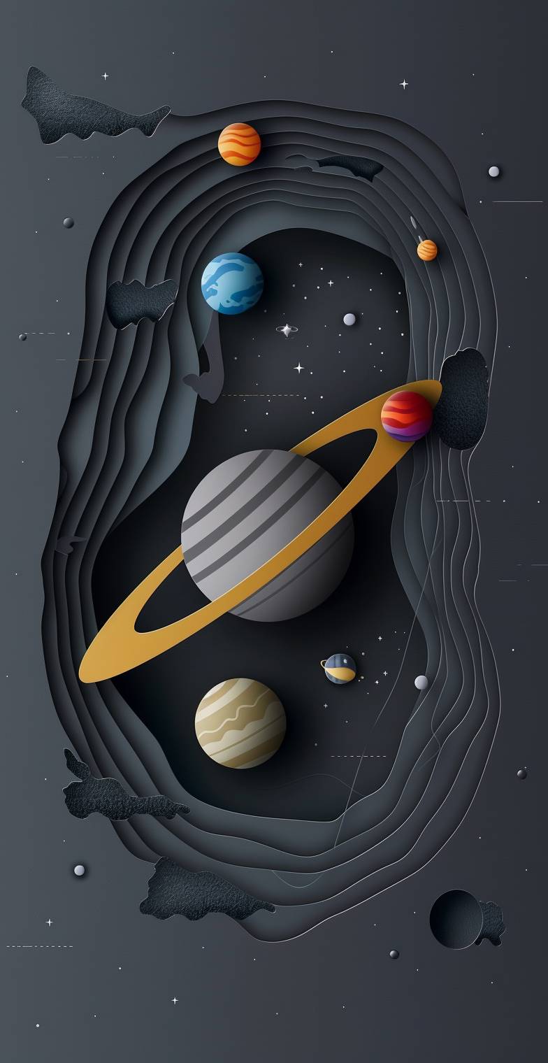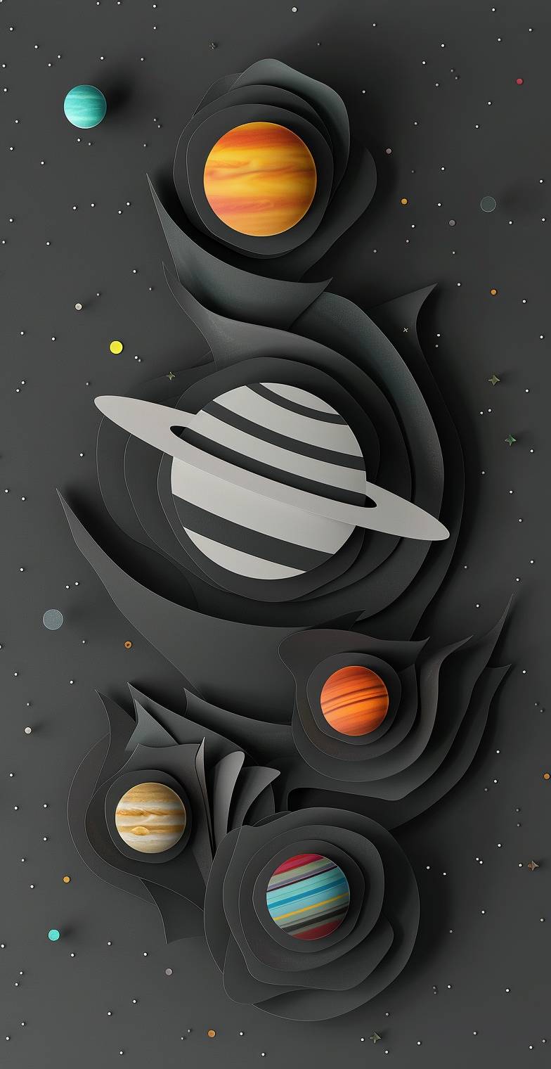 A dark gray background with the planets of our solar system rendered in a paper cut style. The planet Saturn is centered and has its rings fully visible, all other planets are small and colorful, placed around it on different levels, arranged to form an outer rim. This design would create depth using layers of slightly overlapping black paper for shadows. It could be used as a poster or wallpaper, adding fun and curiosity about space exploration to your home decor in the style of paper cuts --ar 18:35 --v 6.0